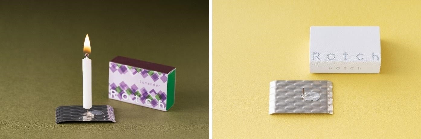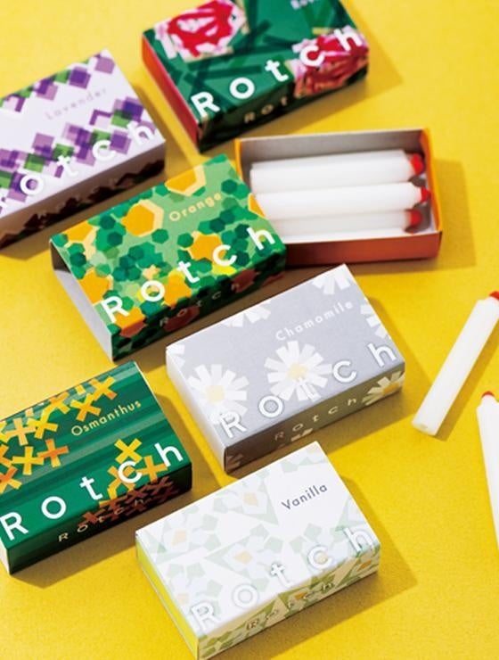捨てるものを素敵に変身させるブランド「リクラ」により開発された、冠婚葬祭で廃棄されるロウソクを再利用して作られたアロマキャンドルです。『ロウソク』×『マッチ』=Rotch(ロッチ)という名前です。〈オレンジ〉〈カモミール〉〈バニラ〉〈ラベンダー〉〈ローズ〉〈キンモクセイ〉の全部で6種類の香りがあり、お通り、ロウソクの先端にマッチが付いたような個性的なデザインで、マッチのように箱の側面を擦って着火でき部屋にポンと置いたままでも香りがするので、いやされます。1本の燃焼時間20分~30分の間に「火から目が離せない不自由な時間」をあえて作ることで、気持ちを休めたり、お茶を飲んだり、日常のちょっとした休憩を楽しめます。別売りのRotch(ロッチ) 専用スタンドと合わせて使用することで、ロウソクを立てる事ができます。