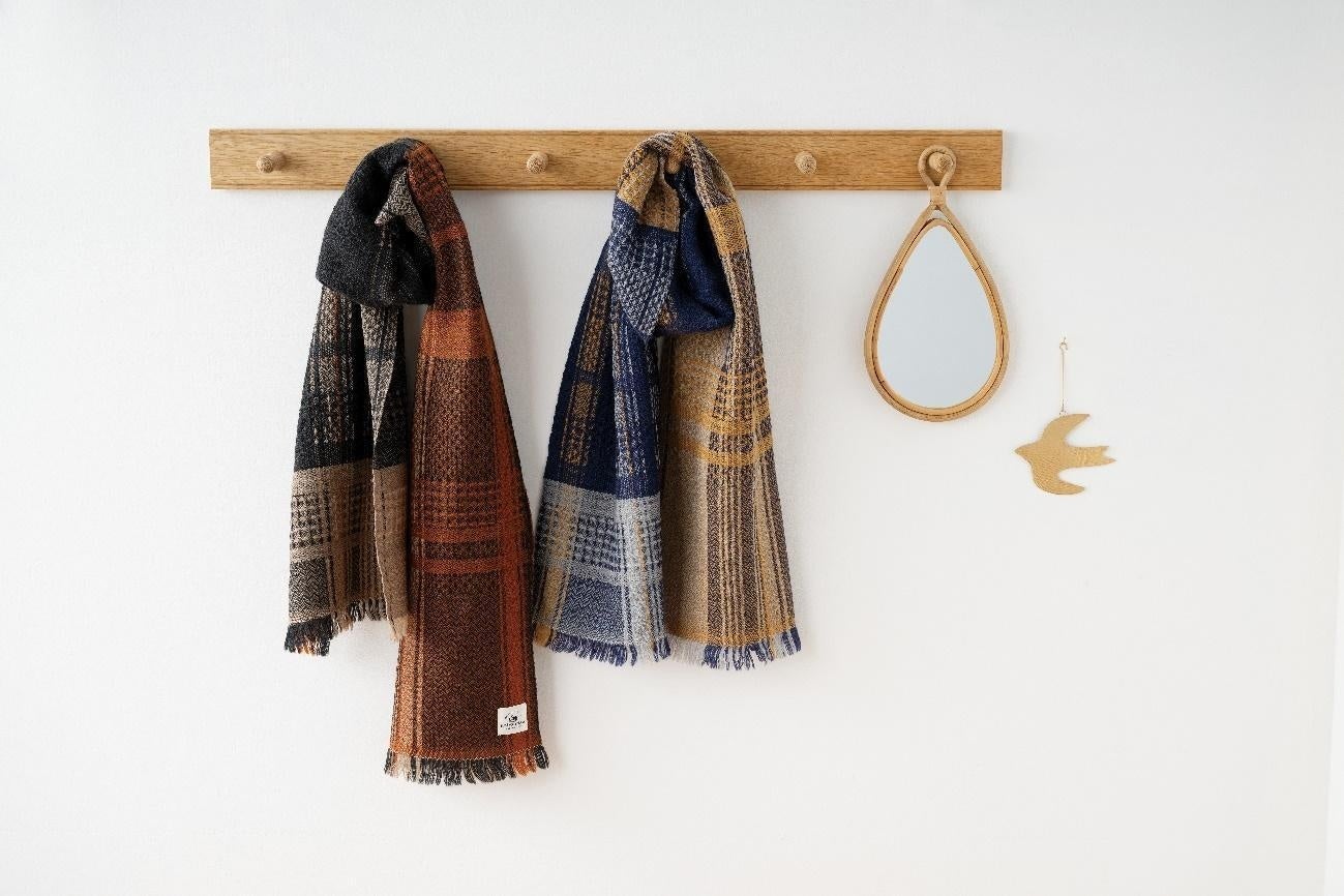 ヘリンボーン・ワッフル・シュス・ナナコ織りの4種の織り柄が美しいマフラーです。タオルの産地・愛媛県今治市でストールやキャップを製作する「工房織座」で一枚一枚ていねいに作られています。どんな巻き方でもバランスよく柄が配置されるよう、何度も試作を重ねて完成します。リバーシブルなので、巻き方によって表情を変えられるのも魅力のひとつです。デザインは〈マスタード〉〈マロンブラウン〉の2種類で、老若男女問わず使える色合いは、贈り物にもおすすめです。くるっとひと巻きするだけで、ほどよく首もとを演出できます。