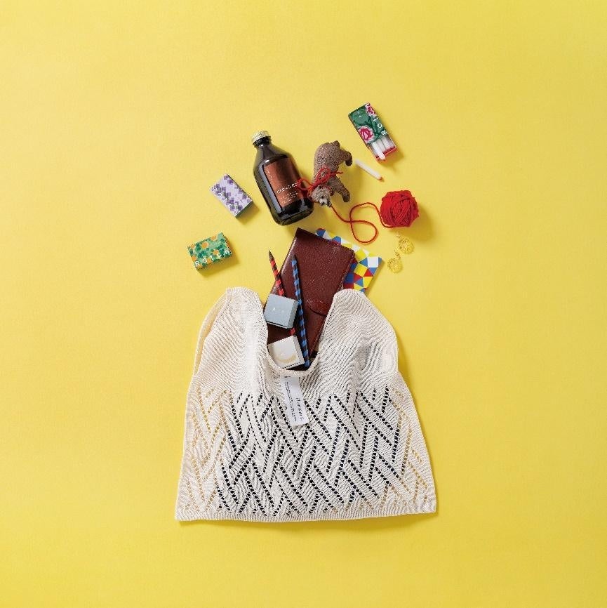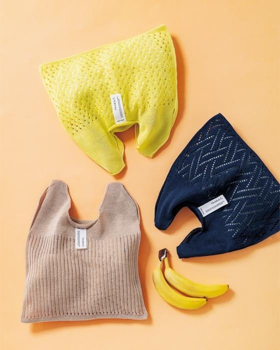 ダイヤ柄、ドット柄、ストライプ柄の3種類の透かし編みデザインがキュートな、ニットのマルシェバッグです。ニットの可能性を考え、ニットの価値を伝え続けるブランド「ThinKniT(シンクニット)」の商品で、国内90%のシェアを誇る手袋の産地、香川県東かがわ市で、手袋を編む技術を生かして作られています。かわいい三角のフォルムにモノを入れると、いろいろなカタチに変化してくれて、軽くてしわにもなりにくいです。デザインは用途別に使い分けたい〈ベーシック〉と、コーデのアクセントにもなる〈アクセント〉の2種類があり、それぞれ3色の展開です。