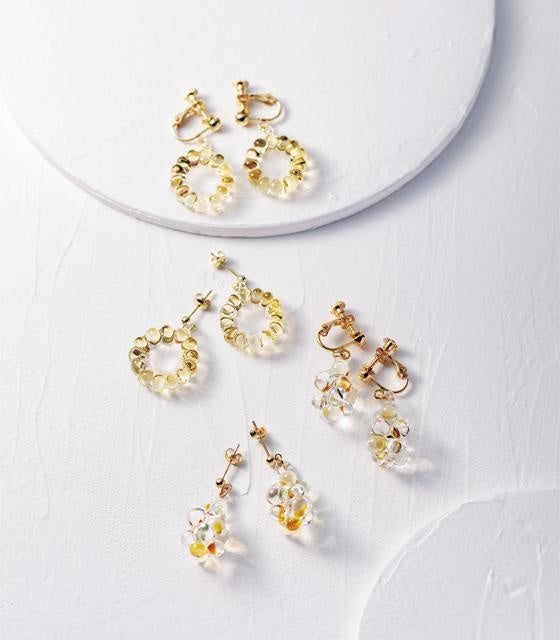 さりげないけれど存在感のある透明なガラスの耳飾りです。オリジナルテキスタイルの布地から仕立てる傘屋「イイダ傘店」の繊細で鮮やかなテキスタイルを、老舗ガラスメーカー・HARIOが手掛けるハンドメイドブランド「HARIO Lampwork Factory」の職人がガラスで立体的に表現しました。小さなガラスのモチーフは、すべて熟練の職人の手によって生み出されています。デザインは、ひとつひとつのガラスの粒が立体的に輝く〈トウモロコシ〉と、粒と粒の間の色ガラスの重なりが美しい〈コモレビ〉の2種類です。