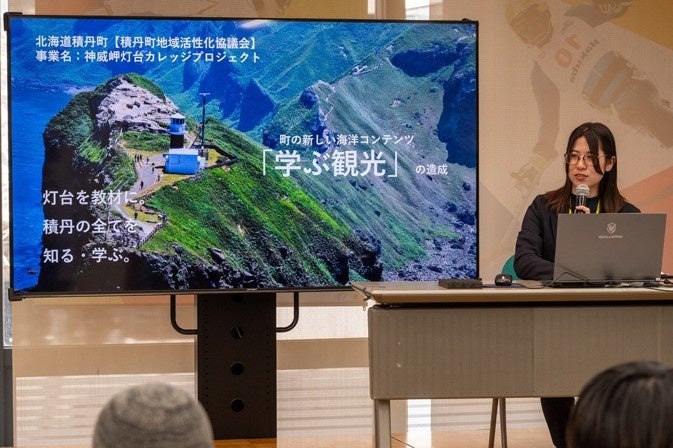 また、かつて同灯台で使われていた、国内に唯一現存する第一等不動レンズの展示室を改修するとともに説明パネルを追加し、訪れた人がこれまで以上に灯台への理解を深めることができるようになったことも紹介されました。発表の結びには、「神威岬灯台を学びの拠点として活用していくためには長期的な計画が必要であることが分かった」として、積丹町内に神威岬灯台を活用するための株式会社を設立すると表明。会場から拍手が起こりました。