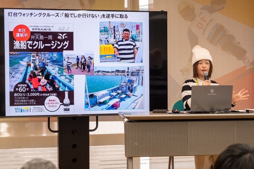 そこで同団体は、船でしか行けないことを逆手に取った「漁船での灯台クルーズ」や、灯台の白黒配色をモチーフにしたオリジナル商品の開発など複数の実証事業を展開し、弁天島と大間埼灯台の観光活用を検証。一定の知見が得られたことから、今後は「日本一おもしろい灯台クルーズ」の実現と事業化を目指していくと話しました。