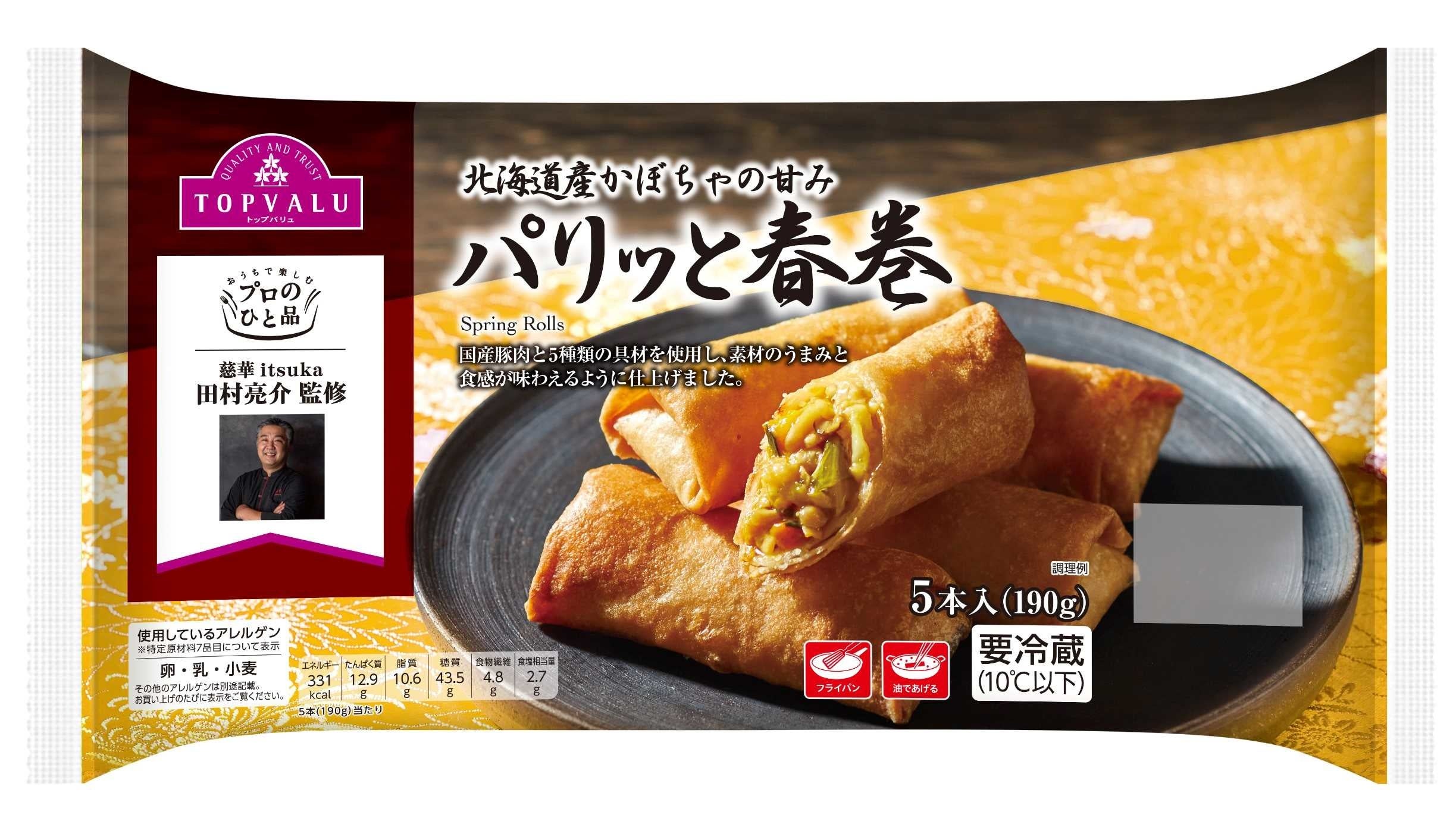 北海道産かぼちゃの皮をむかずにカットし、素材の食感とやさしい甘みを生かしています。かぼちゃの他に、豚肉の旨味とキャベツ、たまねぎ、筍、椎茸を使用した、具沢山でパリパリ食感の五目春巻きです。