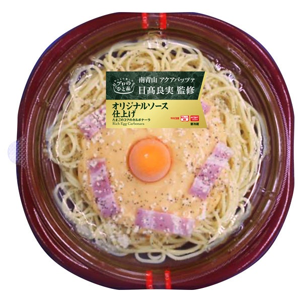 パスタの麺には、もっちりつるみのある食感が特長の乾麺を使用し、卵のコクが生きたオリジナルのカルボナーラソースで仕上げました。さらにトッピングにも卵黄風ソースをし、レンジで加熱して食べる直前に混ぜることで、さらに卵のコクを感じていただけます。