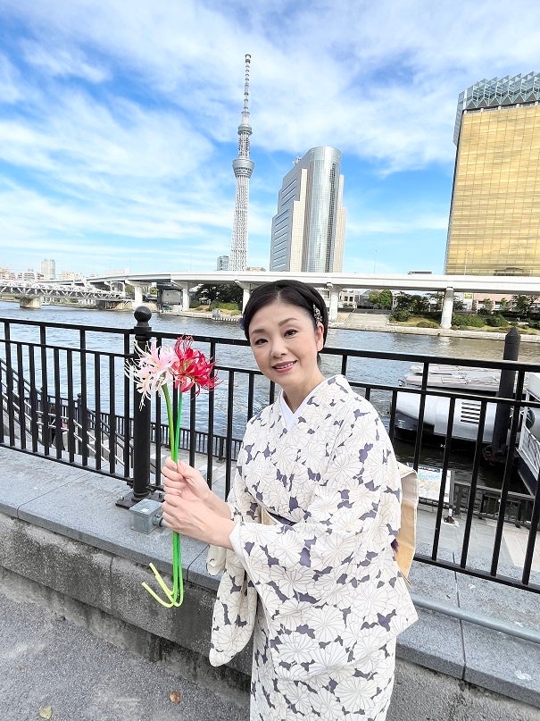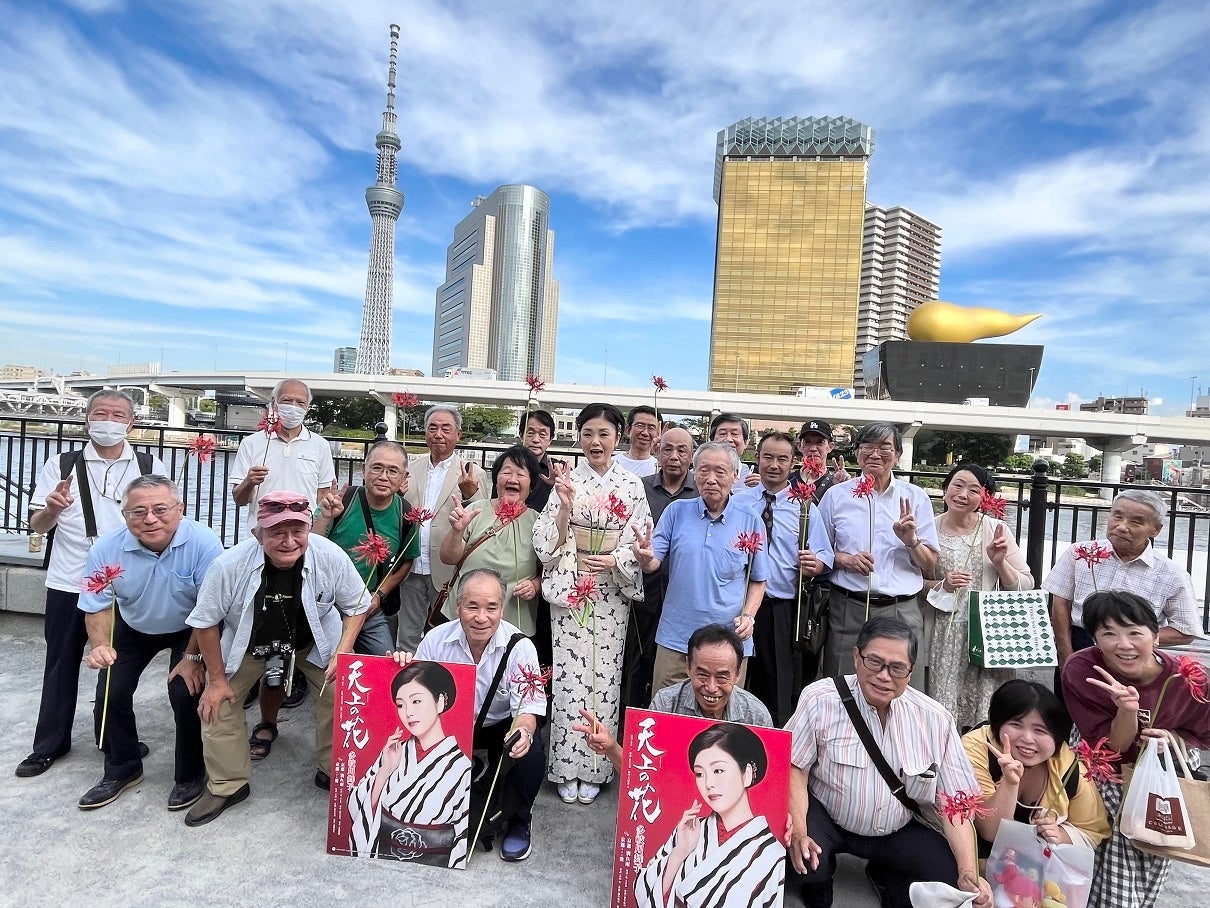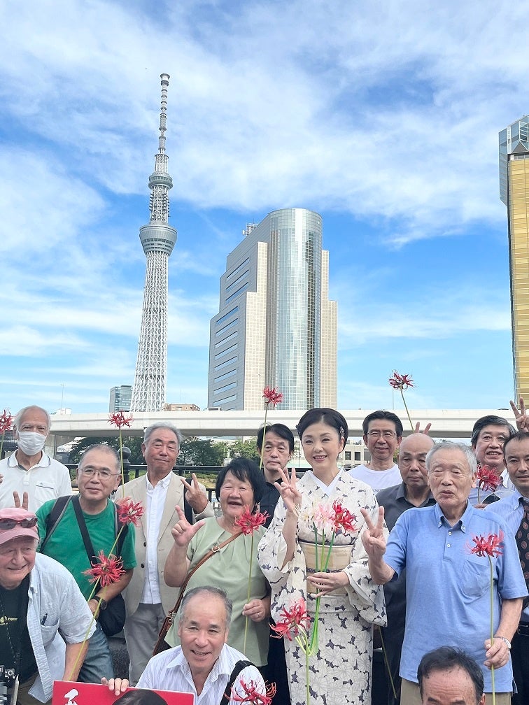 まずは浅草の隅田川にてファンと記念撮影大会。新曲タイトルの“天上の花”は彼岸花の別名。それぞれ彼岸花をもったファンとともに記念撮影をおこなった。