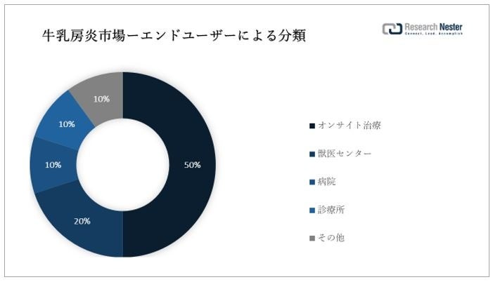 エンドユーザーに基づいて、世界の牛の乳房炎市場はセグメント化され、獣医センター、病院、診療所、オンサイト治療などへの需要と供給について分析されています。 これらのうち、オンサイト治療セグメントは、予測期間にわたって大幅な速度で成長すると推定されています。このセグメントの成長は、世界中の酪農場産業の大幅な成長と、それに続く世界中の獣医師の数の急増に起因する可能性があります。たとえば、現在、米国では 48,700 人を超える獣医師が働いています。