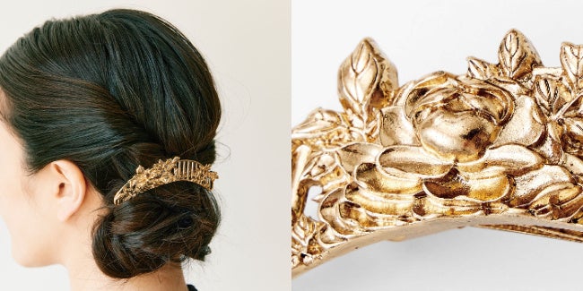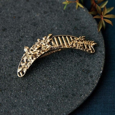 『今様櫛きん雛形』に描かれた、北斎がデザインした櫛の図案を再現したバレッタです。北斎の描いた「ばら」の花の造形が細部までていねいに表現されています。モチーフの背景にある櫛の歯をイメージした透かしデザインも魅力です。細やかなデザインとやさしい金色が顔まわりに華やぎを添えます。