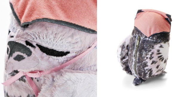 ふくろう本体、頭巾、くちばしなど、それぞれ異なる素材で立体的に表現されています。背中のポケットには、リップクリームなど小物類をまとめて入れることができます。