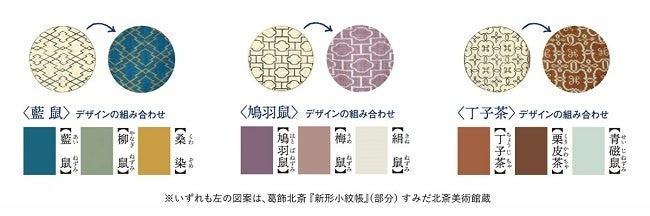 デザインは【藍鼠】【柳鼠】【桑染】を組み合わせた〈藍鼠〉、【鳩羽鼠】【梅鼠】【絹鼠】を組み合わせた〈鳩羽鼠〉、【丁子茶】【栗皮茶】【青磁鼠】を組み合わせた〈丁子茶〉の3種類です。