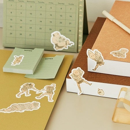 絵手本『北斎漫画』の中からセレクトされた人物たちをモチーフにしたダイカットステッカーです。再はく離タイプの粘着剤なので、貼ったりはがしたり、いろいろな場所で楽しむことができます。