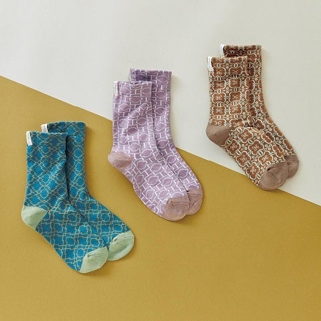 『新形小紋帳』に描かれた、北斎が着物のためにデザインした文様をモチーフにした靴下です。編みで表現された小紋柄が、北斎が活躍した江戸時代を代表する伝統色「四十八茶百鼠」から選んだ色の組み合わせでまとめられています。