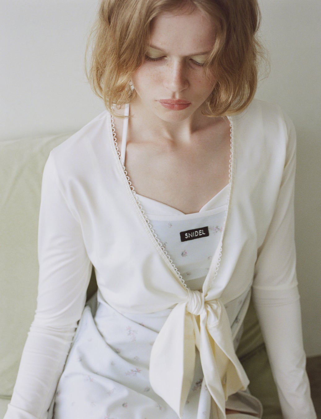 スカラップレースが可愛いカシュクールデザインの長袖ラッシュガードはクロップド丈なのでスタイルアップ効果も抜群。背中側はリボン結びでワンポイントに。