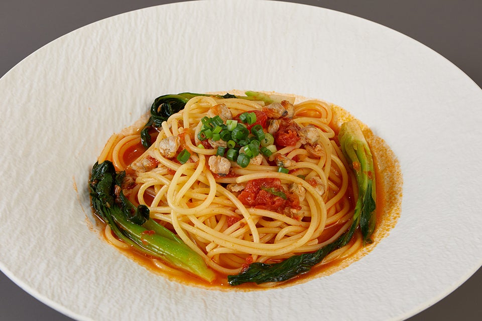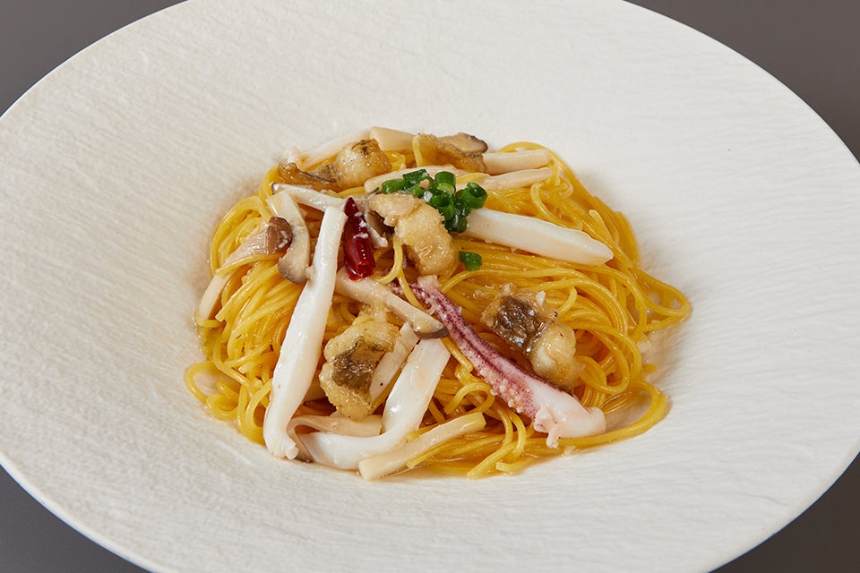 アラカルトでは、雲南市吉田町で栽培した鷹の爪を練り込んだパスタが登場。鷹の爪の風味を生かすよう低温熟成でじっくり乾燥させたパスタは、「浜田漁港で水揚げされた剣先イカ」と「奥出雲エリンギ」を合わせて香りのよいペペロンチーノに仕上げました。