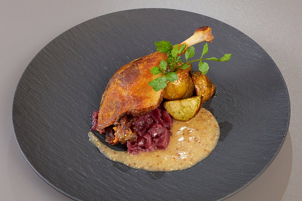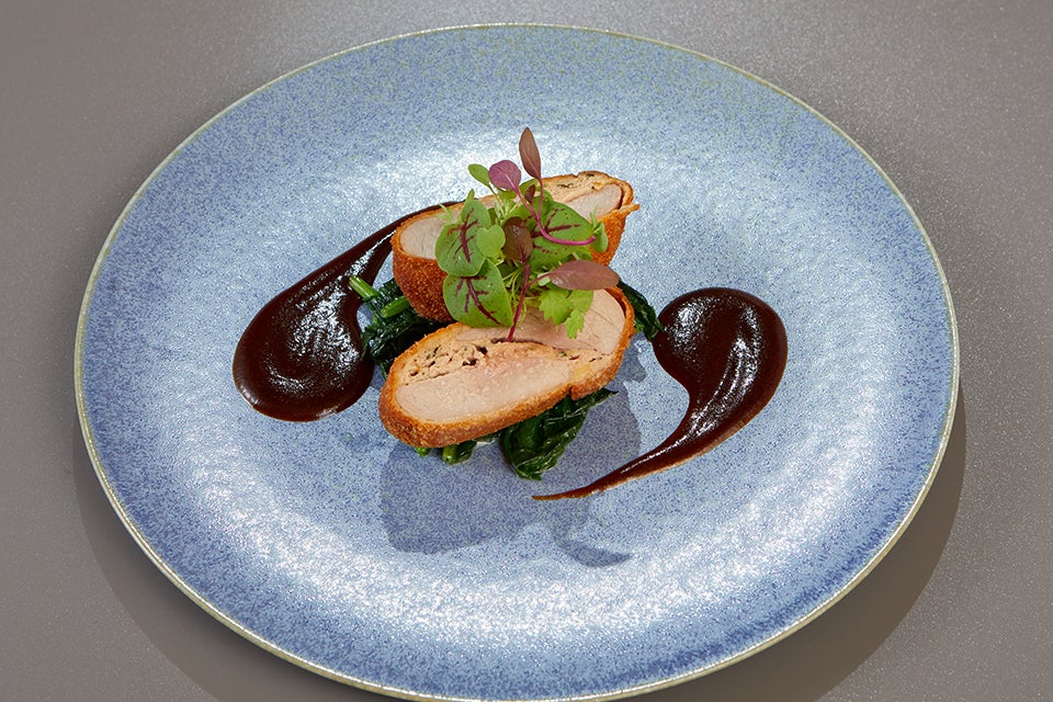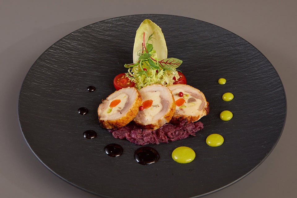 ランチ・ディナーショートコースの前菜は「石見 銀山赤どり(地鶏)」を使用したガランティーヌ。中心は燻製したむね肉、砂肝、ピスタチオを合わせてムース状にし、スチームで蒸し焼きにしました。お好みでバルサミコソースとグリーンマスタードソースとともにお召し上がりください。