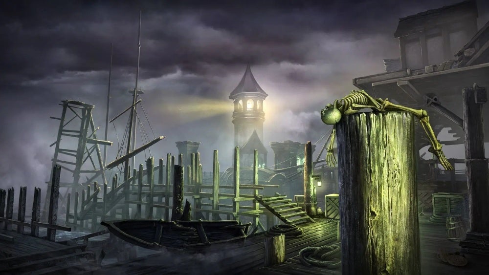 タムリエル史上最大の艦隊と言われる伝説の全旗海軍は、第一紀のスラシアの疫病の根源となったスロードを撃破したと信じられていました。かつて栄華を極めた海軍が誇った数ある造船所の1つとなるこの地は、厄災と時間の経過によって失われたと思われていましたが、今では安らぐことのない魂と死者の住処と化しています。船大工の後悔の秘密を探ろうと試みるのは勇敢な、あるいは無謀な冒険家だけであり、ザジ船長はもちろんそのうちの1人です。