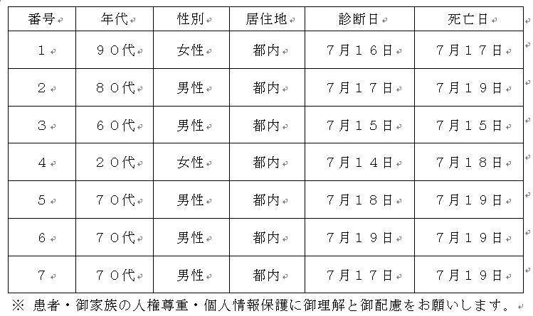 都内で新型コロナウイルスに感染した方が死亡されましたのでお知らせします。