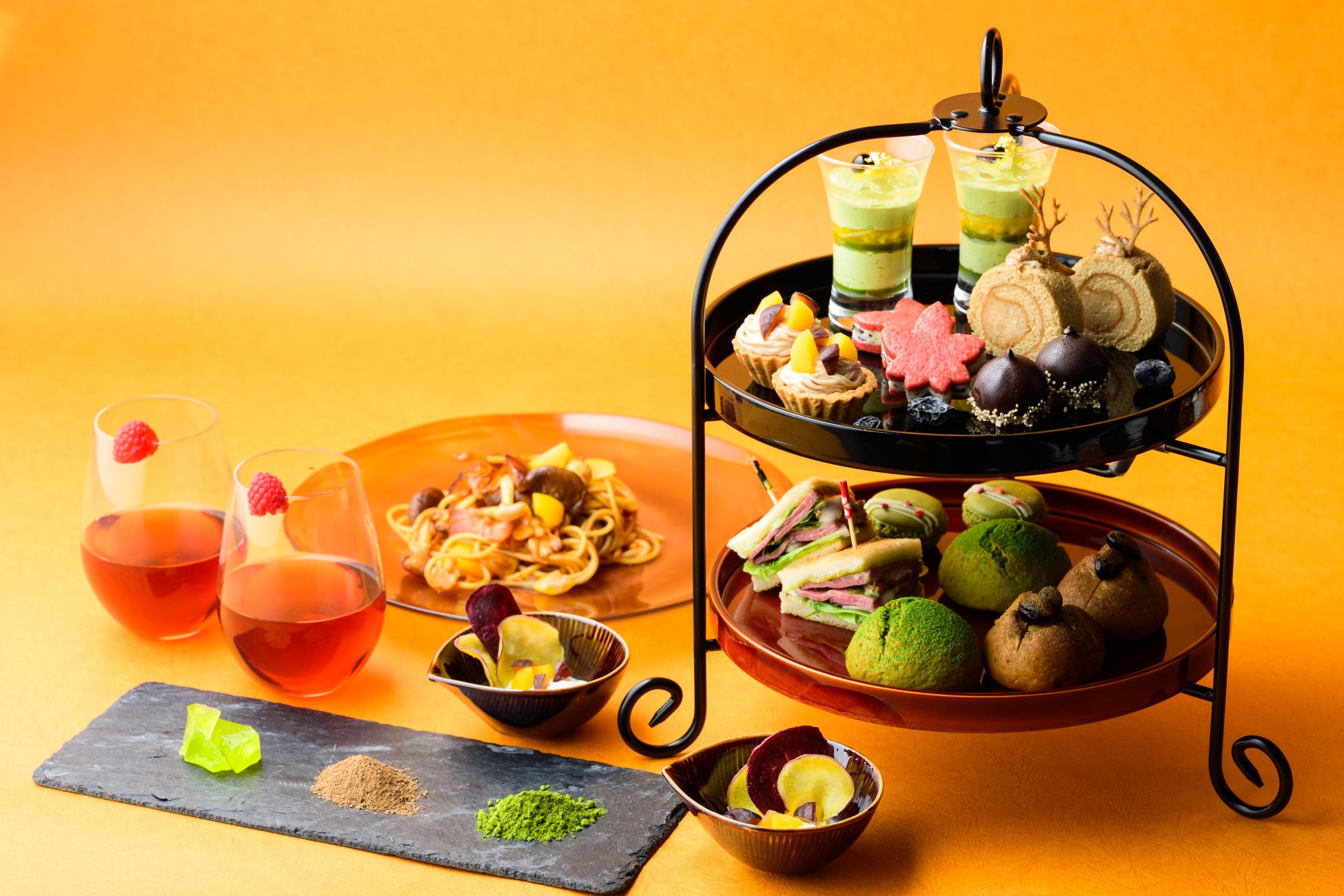 上段には、口にいれた瞬間カカオの甘い香りとほうじ茶の香ばしさが広がるほうじ茶のボンボンショコラ、上品な和の雰囲気を漂わせる柚子を使ったジュレや奥深い香りでやさしい口当たりの抹茶ムースを層にしたグラスパフェなど6種類のスイーツが並びます。下段には、生地にほうじ茶を練り込みふんわりと焼き上げたブリオッシュや、ほくほくのかぼちゃとローストビーフを、抹茶と香味野菜を合わせたレムラードソースでコク深い味わいに仕上げたサンドウィッチなど、お食事系メニューをご用意しました。別添えのパスタは深みがでるようほうじ茶で麺を茹で、そこに秋が旬のきのこや栗をあわせ、焦がし醤油で香ばしく和風テイストに仕上げました。また、お茶の風味をより味わえるよう祇園辻利の抹茶とほうじ茶のパウダーを別添えでご用意しますので、お好みでかけてお召し上がりください。また、ウェルカムドリンクとして「ラズベリーほうじ茶」をご用意します。ラズベリーの甘い香りと酸味がスモーキーなほうじ茶とマッチします。その他にも祇園辻利のほうじ茶「古都かをり」をお好きなだけお楽しみいただけます。