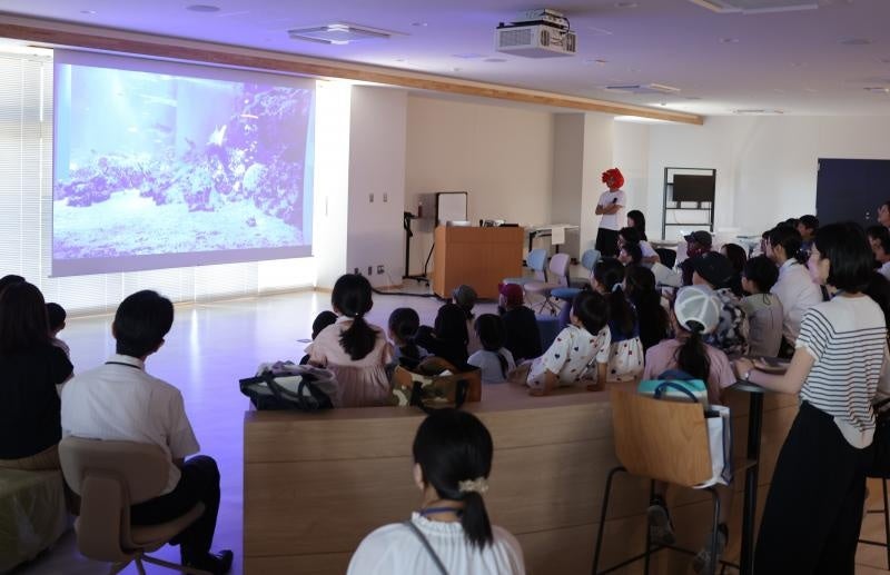 次に、本学大学院ヘルスシステム統合科学研究科の堀内涼太郎さんがオンライン水族館「Aqzoo(アクズー)」の上映を行いました。堀内さんが全国各地の水族館で自ら撮影してきた動画が大画面に映し出され、子どもたちは水族館のさまざまな生き物の映像を食い入るように見入っていました。上映後は、海の生き物に関するミニクイズ大会もあり、6問全問正解をした子どもたちには、岡大きびだんごがプレゼントされました。