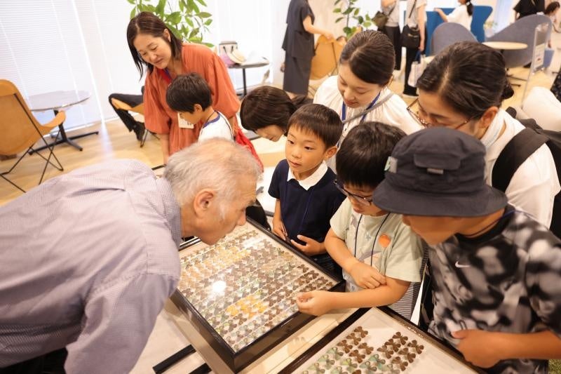 ワークショップでは、本学の学生スタッフがサポート役として加わり、海の生き物の塗り絵や樹脂粘土のマグネットや魚釣りのおもちゃづくりなど、子どもたちの希望に沿ったプログラムを楽しみました。また、スペシャル企画として、ダイバーシティ推進本部の富岡憲治教授が採集した貴重な蝶の標本が会場の一角に設置され、参加者は、富岡教授に採集場所や蝶の名前などを質問しながら珍しそうに眺めていました。