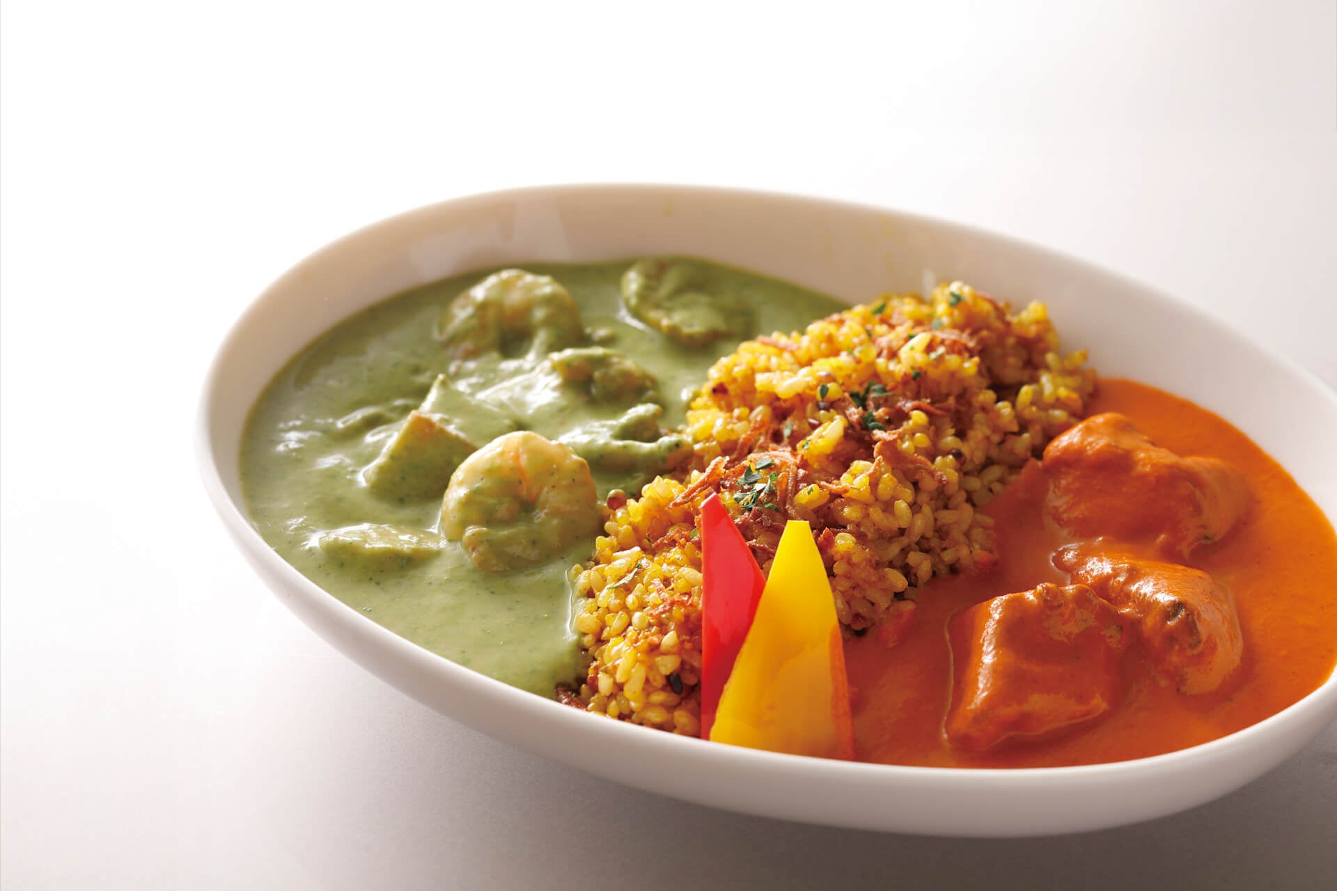 牛ほほ肉の旨みが凝縮されたレッドカレーと、オマール海老や鮑を贅沢に使ったグリーンカレーを一皿で。異なる個性が絶妙に調和したリッチな一品。