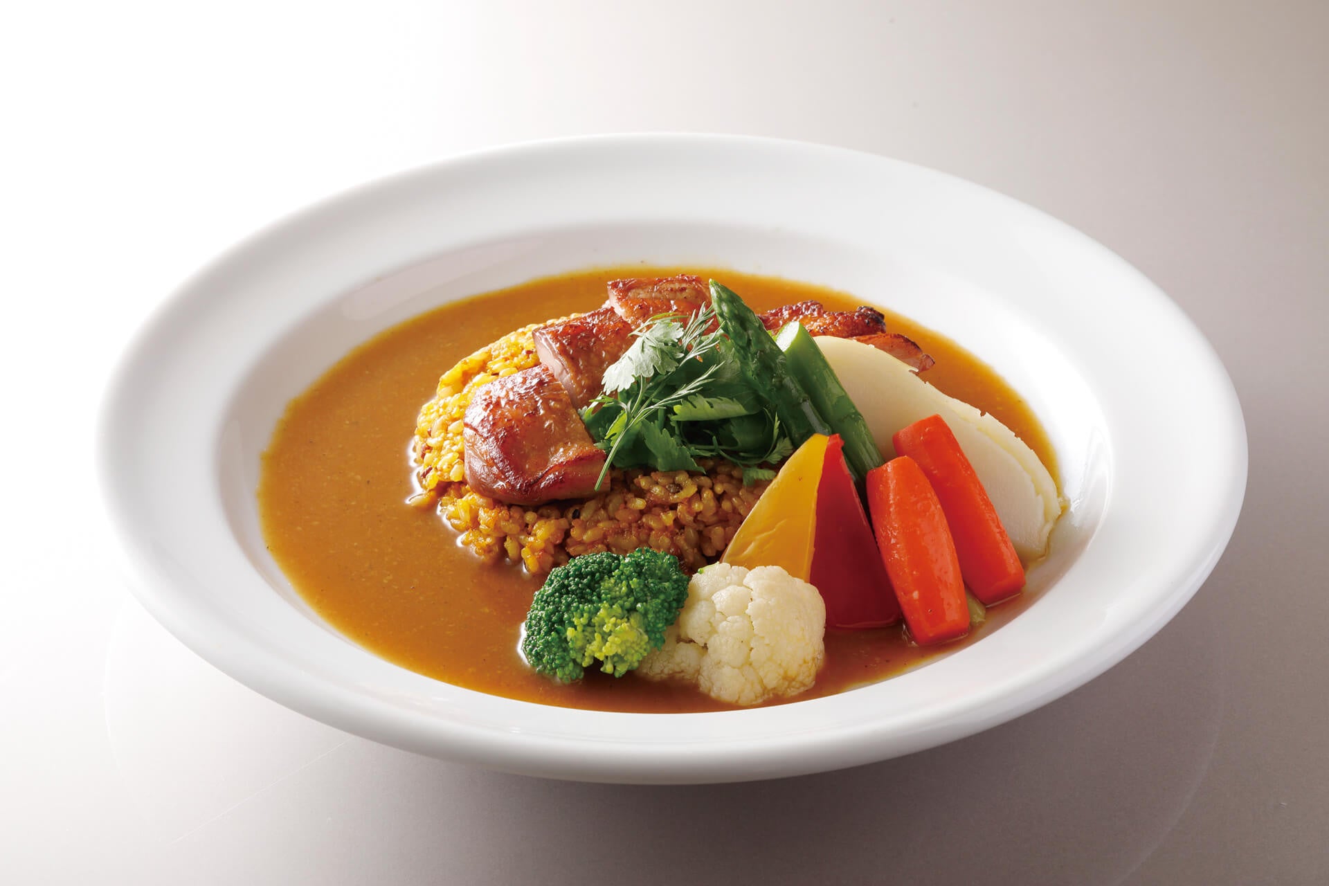 ブイヨンと特製ダレで漬け込んだジューシーな鶏もも肉に、スパイス香るスープカレーを合わせた逸品。健康志向の“Jシリアルサフランライス”との相性も抜群。