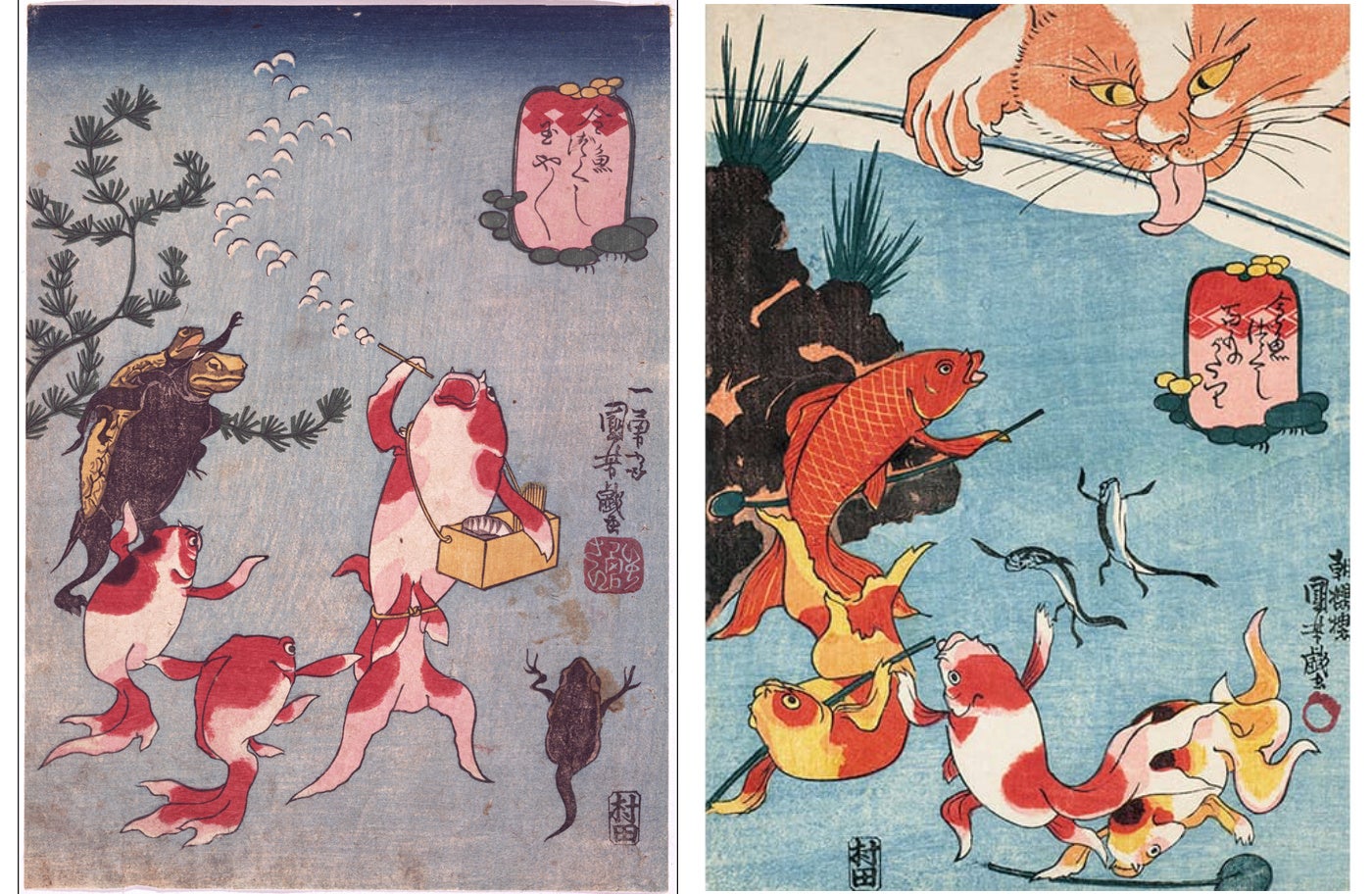 歌川国芳『百ものがたり』(右)。中判錦絵、約27×19.5cm、江戸時代後期。江戸時代に流行った怪談会「百物語」に金魚たちが興じている。
