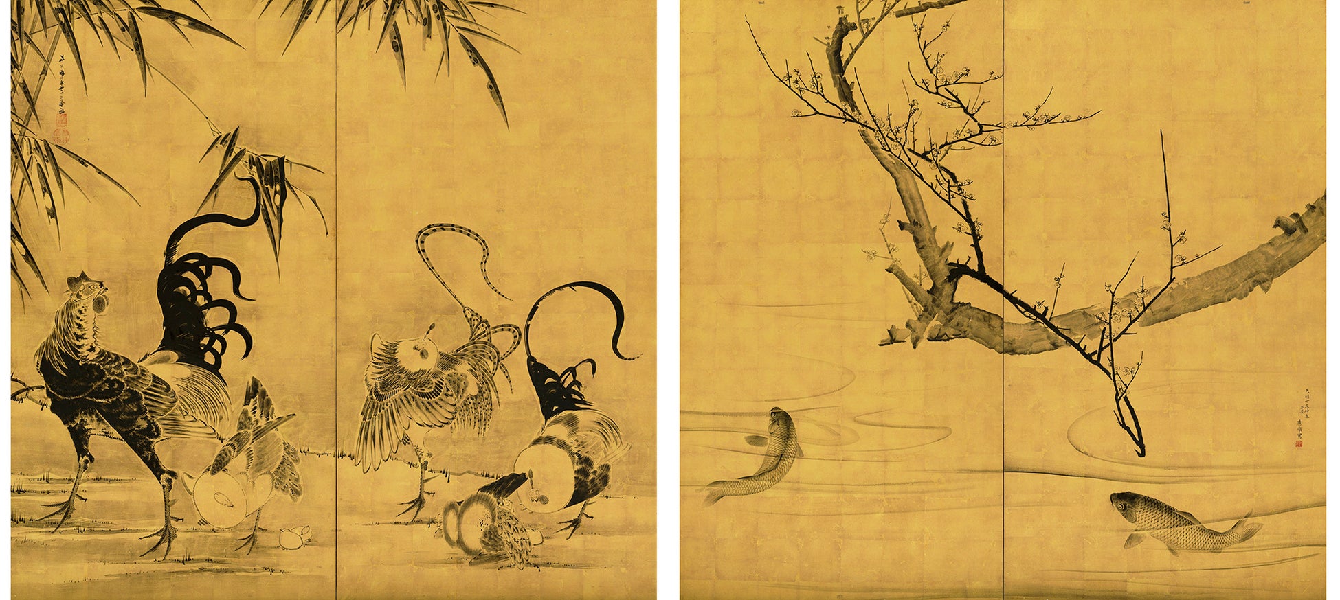 円山応挙『梅鯉図屏風』(右)、伊藤若冲『竹鶏図屏風』(左)。