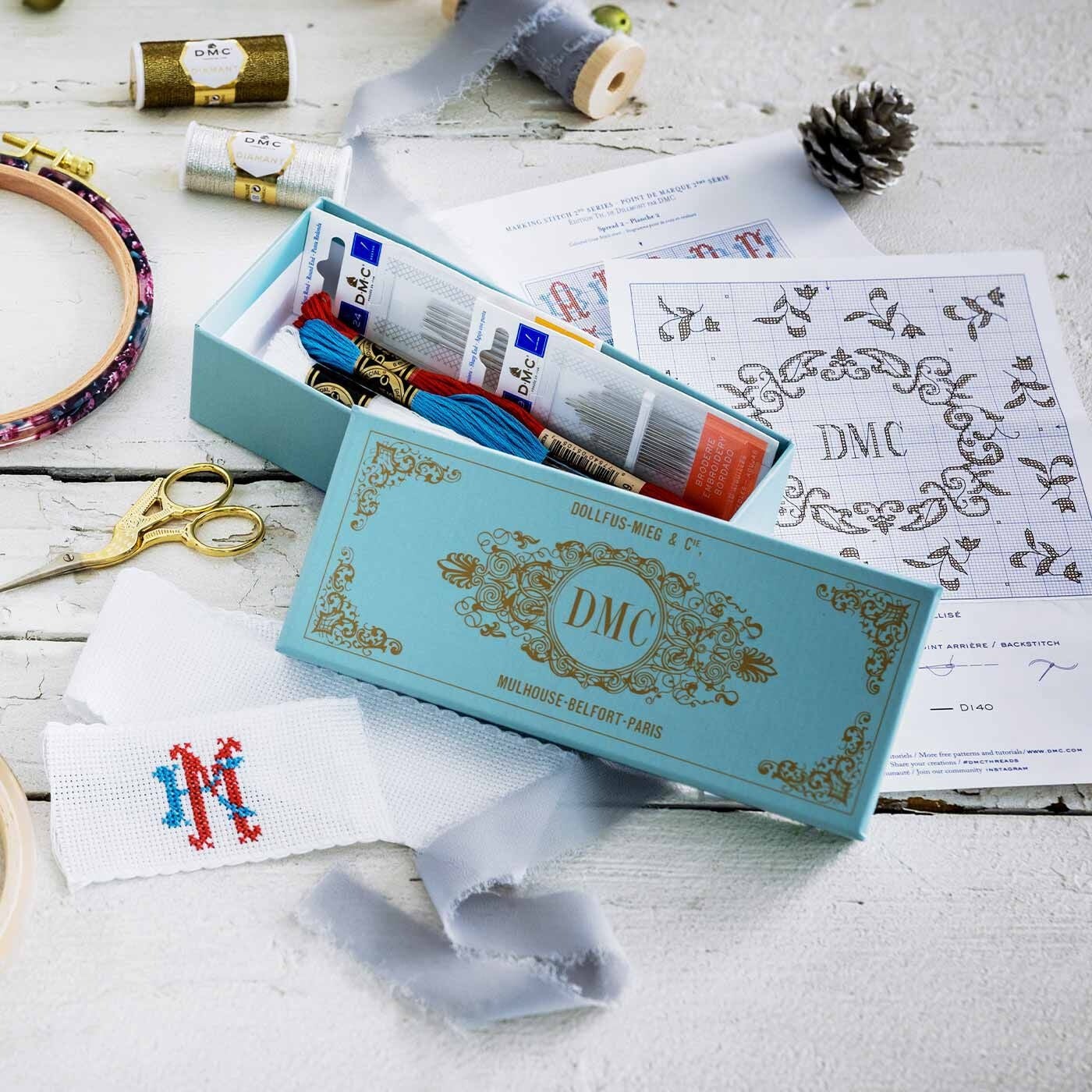 DMC社のアーカイブコレクションから厳選したヴィンテージボックスに、クチュリエ限定のアソートセットです。高級感あるブルーの紙箱はお裁縫箱にするのはもちろんのこと、お気に入りのパーツのコレクションボックスにも最適です。はさみ、刺しゅう図案、金色・銀色を含む刺しゅう糸5色&刺しゅう針など魅力的なセットになっています。