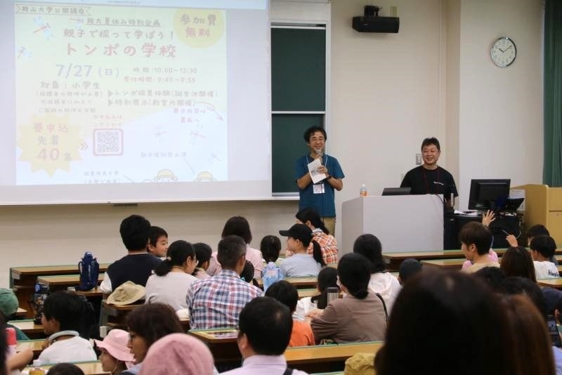 国立大学法人岡山大学(本部:岡山市北区、学長:那須保友)は、2025年7月27日に、本学工学部が公開講座「トンボの学校:岡山大学でトンボを採って種類や生態を学ぼう!」を開催し、小学生45人を含む計102人の親子が参加しました。