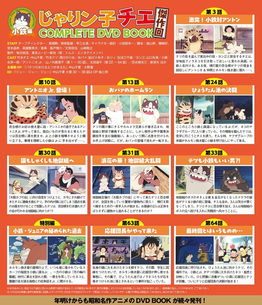 「じゃりン子チエ 傑作回COMPLETE DVD BOOK」は【テツ編】と【小鉄編】の全2巻。【小鉄編】には、作品屈指の人気を誇るチエちゃんの飼い猫・小鉄たちの武闘派エピソードを中心に10話(約4時間)収録。先月発売となった【テツ編】は、破天荒でトラブルメーカー、でもどこか憎めないチエの父・テツの爆笑エピソード満載の内容となっています。HDリマスター版での収録となっているので、高画質でぜひチエちゃんの世界をお楽しみください。