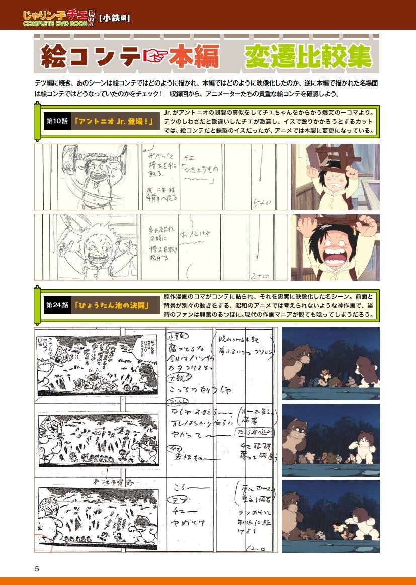 保存版のブックレットには、「収録話見どころ&解説全紹介」「絵コンテ→本編 変遷比較集」「OPギャラリー&絵コンテ」「小鉄&Jr.セル画 セル画セレクション」と、貴重な資料が続々。そして、【テツ編】のテツ役・西川のりおインタビューに続き、【小鉄編】ではチエ役の中山千夏インタビューを掲載。オファー当時は参議院議員をしていたため、芸能活動を控えようと思っていたという中山。しかし、「これは私がやるしかない!」とチエの役に惚れ込んだそう。収録や作品にまつわる秘話はもちろんのこと、作者のはるき悦巳や監督の高畑勲などの貴重なエピソードも盛りだくさん。さらに中山と西川の「交換メッセージ」を掲載。映画版でのアフレコ以来となる誌面上での再会は必読です。