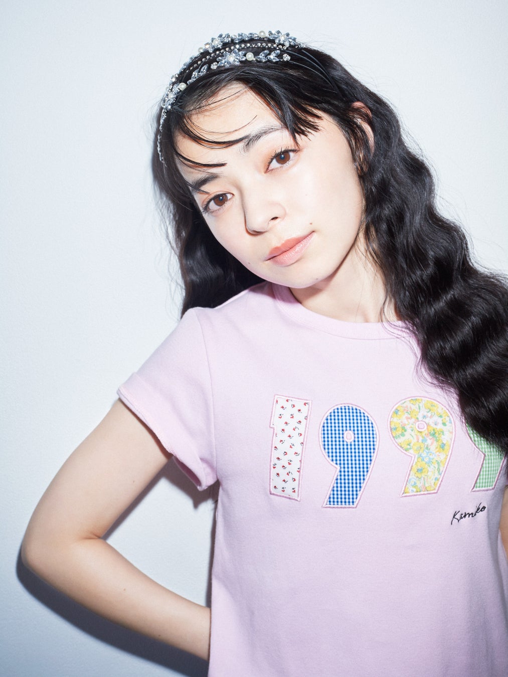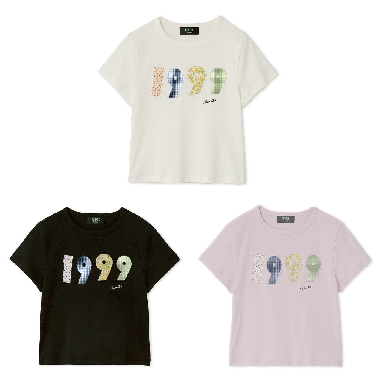上國料さんの生まれ年である「1999」を一文字ずつ異なる花柄を使用したアップリケで表現したメモリアルなTシャツ。
