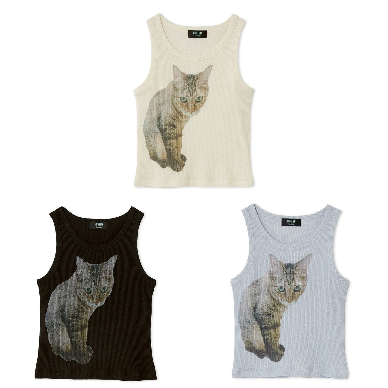 愛猫「Seira」を大胆にプリントしたタンクトップは、柔らかく繊細なテレコ生地なので着心地も抜群。