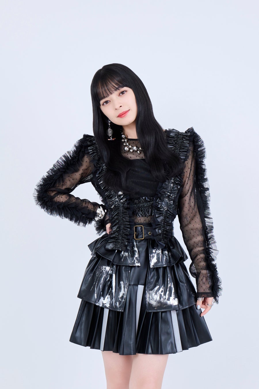 華やかでフェミニンなスカートと合わせることで、モードさとフェミニンさのバランスが取れたスタイリングが楽しめます。