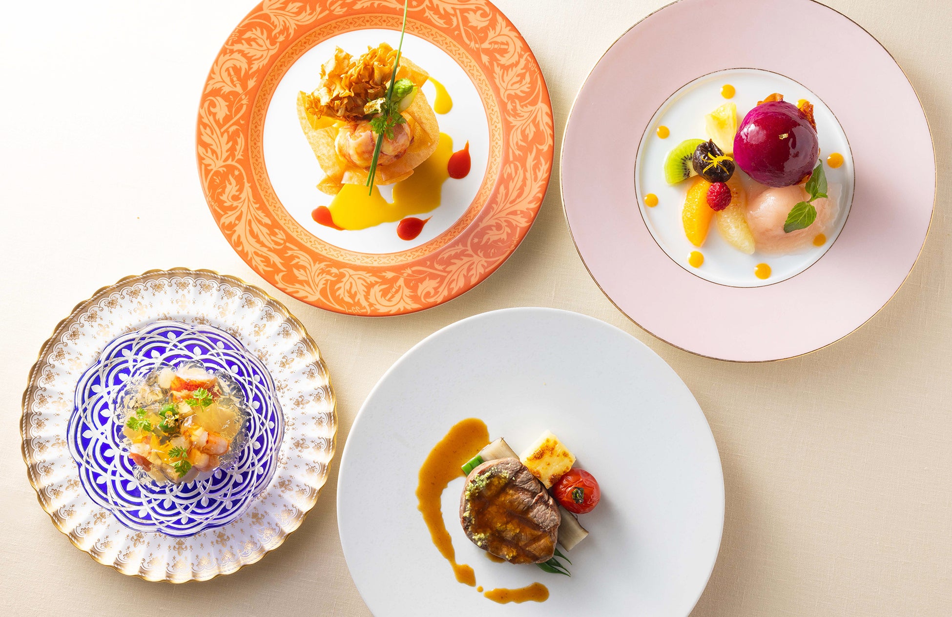 「クイーン・アリス」ならではの“スペシャリテ”が揃うシェフおすすめのコースが、新登場です。海老、蟹、鮑などの“海の幸”を、三杯酢のジュレと柚子ドレッシングでさっぱりとお召し上がりいただく「贅沢サラダ」をはじめ、コンソメで柔らかく煮た大根と、香ばしくソテーしたフォアグラを、鴨のジュ、ガーリック、醤油をベースにしたソースで味わうシグネチャーディッシュ「フォアグラのソテー 大根添え」のほか、「オマール海老のフリカッセ」や「和牛サーロインの網焼きワサビ風味」など、開業時より変わらない味で、多くのお客さまに愛され続けている「クイーン・アリス」の美味を、存分にご堪能いただけます。