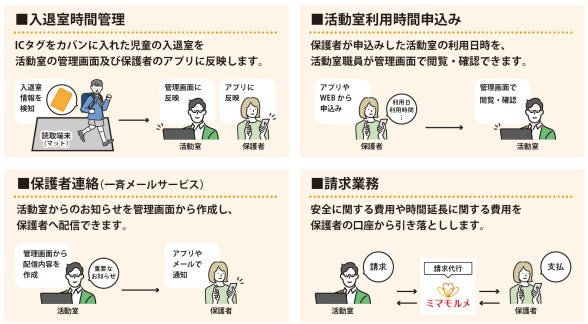 今まで書面で実施していた、いきいき活動室の年間利用登録や利用時間の管理、保護者との連絡、費用請求をデジタル化することで、児童の安全確保や保護者の利便性向上、活動室職員の業務効率化を図ります。
