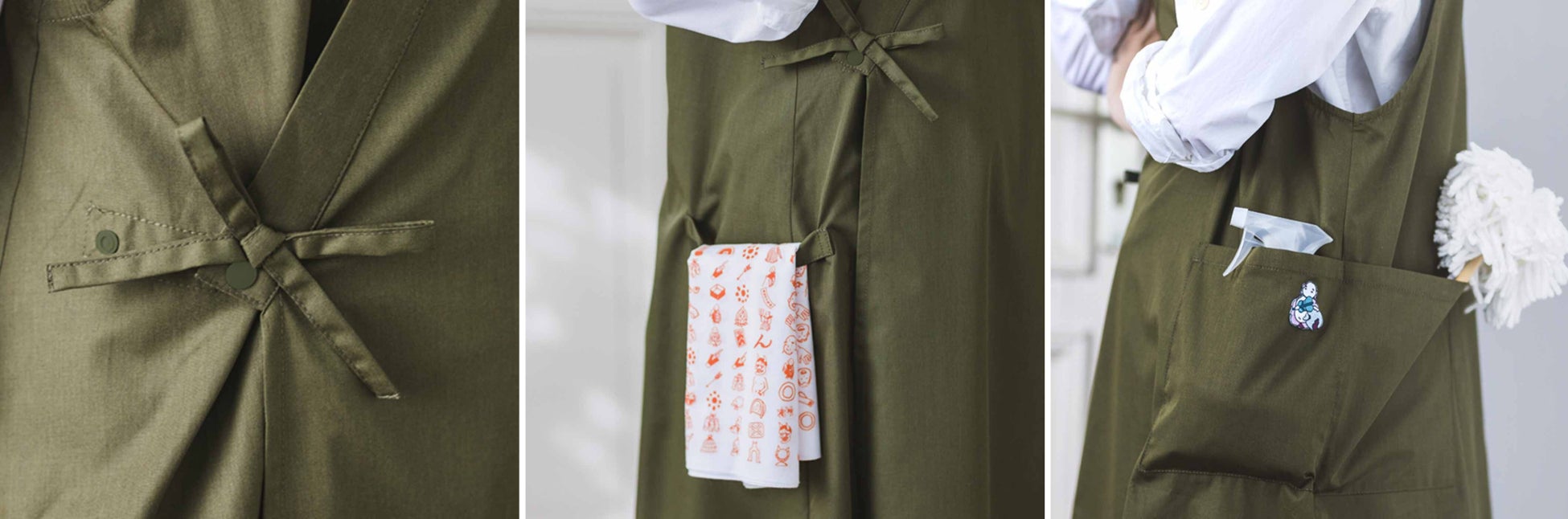 リボンをあしらったスナップボタン仕様で、2段階でサイズ調節ができます。サイドには、さっと手をふけて便利なタオル掛けループと、掃除用具などがたくさん入る大きめの仕切り付きポケット付きで、家事をサポートしてくれます。