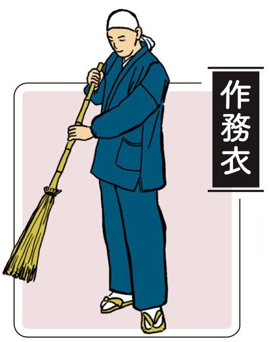 もとは禅寺でお坊さんが掃除などの労働(作務)を行うときの衣類です。修行の場を常に整え、掃除という修行を通して自らの心を見つめます。その結果、清らかな心と悟りを得ることができるといわれています。