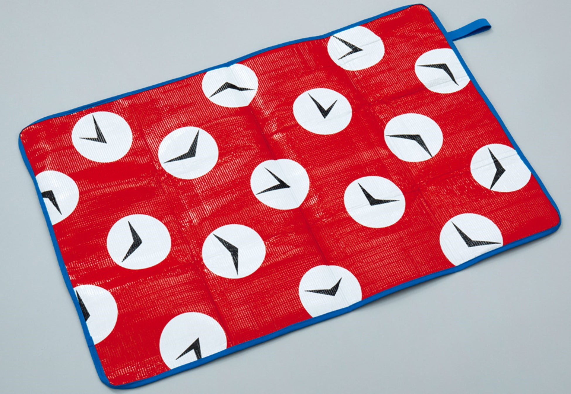 サイズは約タテ60cm×ヨコ90cm。クッション素材で座り心地のいいブルーの面。この上に座っても、時の流れは変わりませんのでご安心あれ!