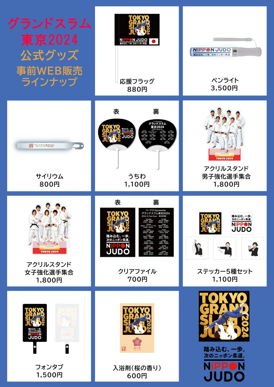 2024年11月26日(火)正午より、「チケットぴあ グッズ通販サイト」(https://fan.pia.jp/shop/)にて、12月7日(土)・8日(日)に東京体育館で開催される「パーク24presentsグランドスラム東京2024」の大会公式グッズの販売を開始いたしました。