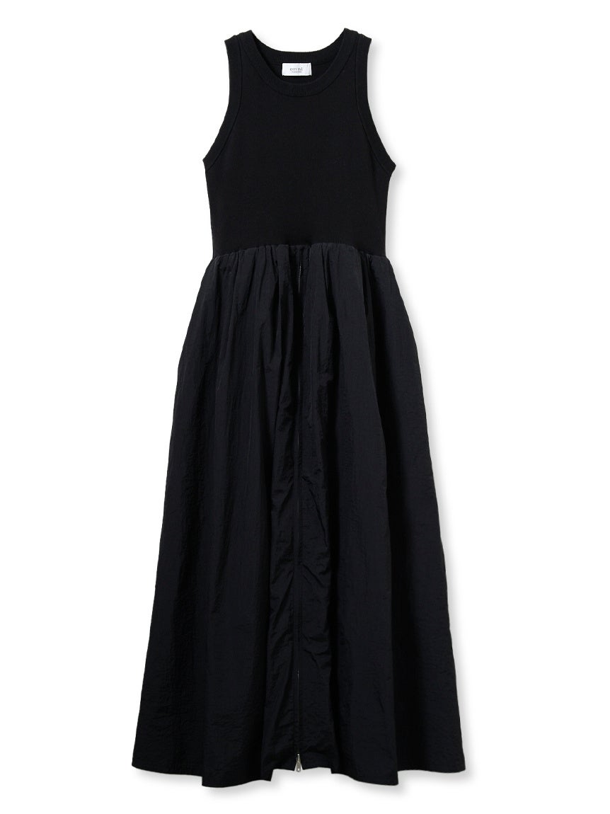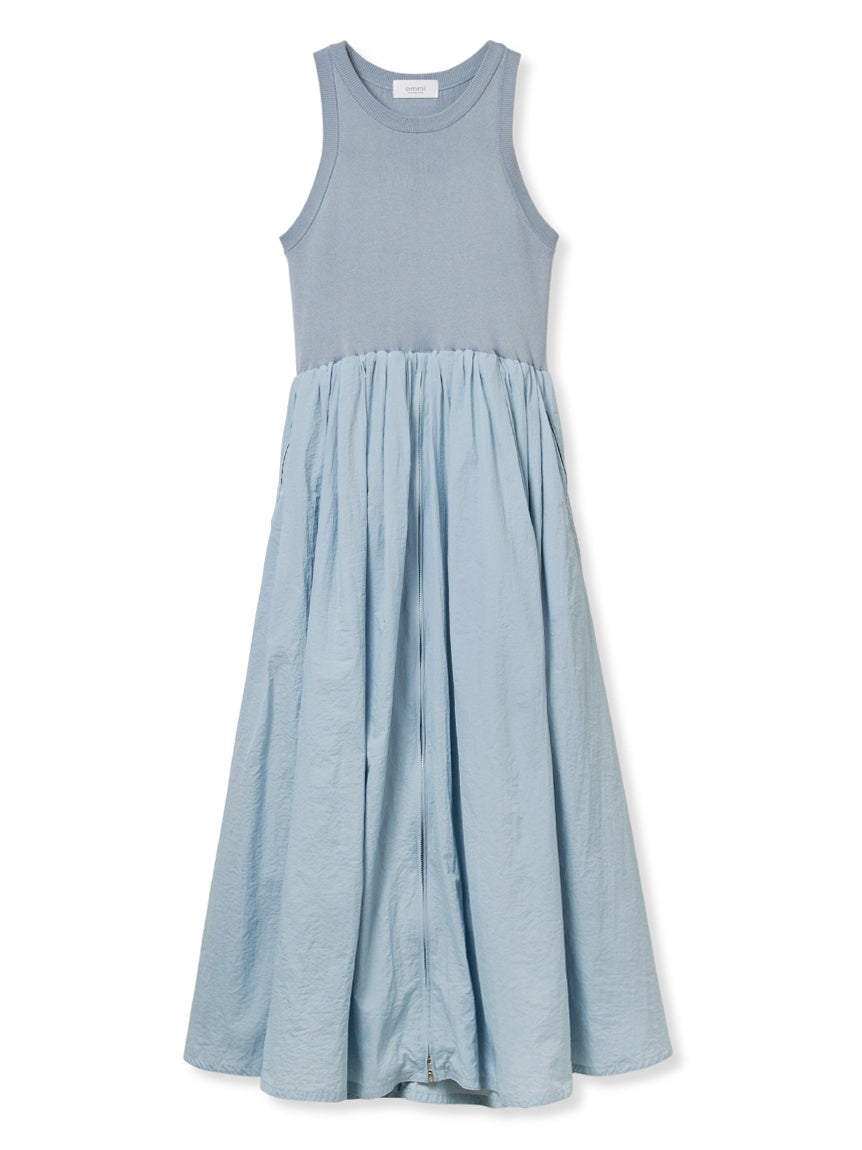 肌馴染みの良いニットタンクトップとemmiらしいスポーティーなタフタ素材のスカートをドッキングしたワンピース。スカートはボリュームたっぷりのシルエットにセンタージップアップがemmiならではのキャッチーなデザインです。レギンスやボトムをレイヤードしてお好みのスリットを楽しめます。