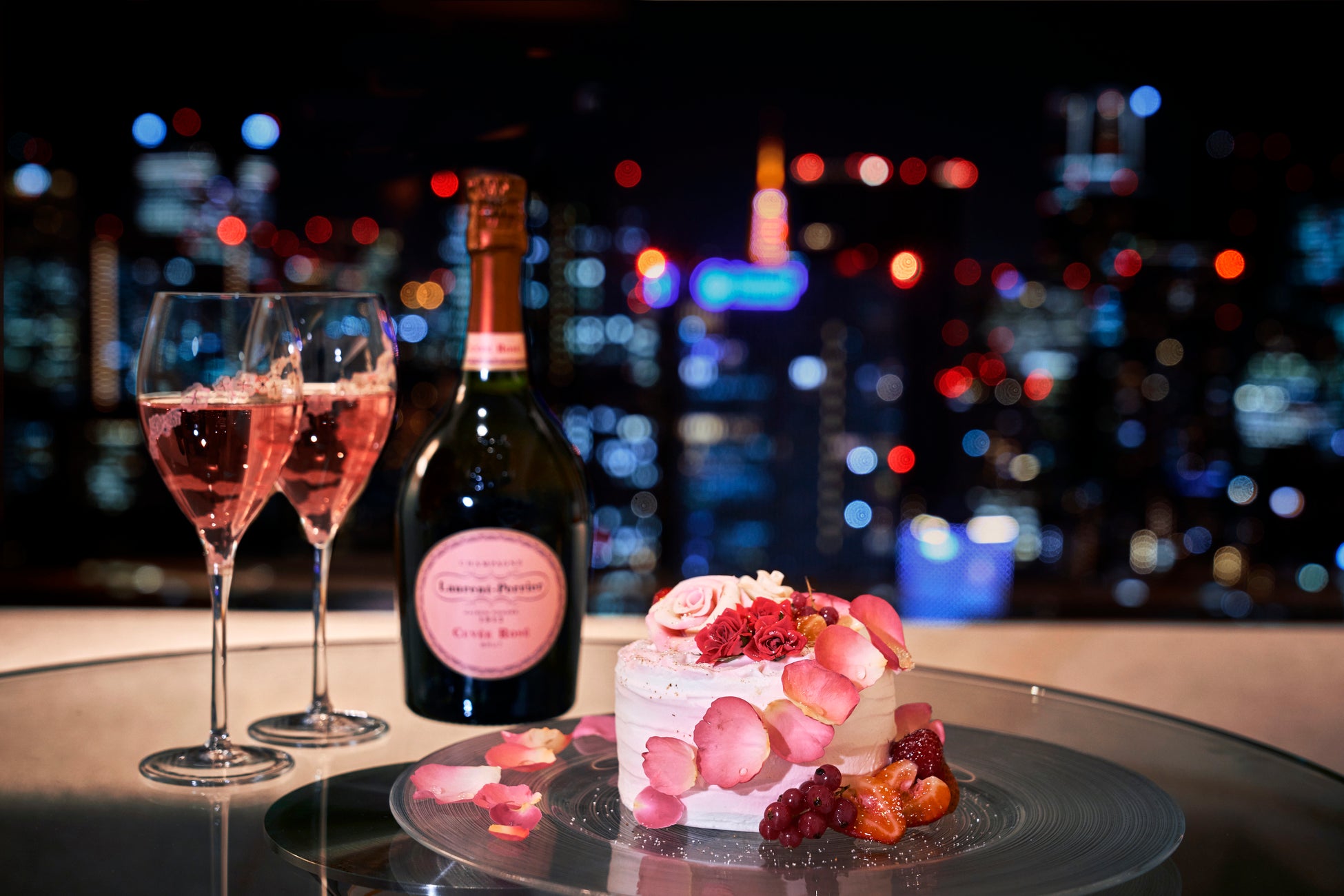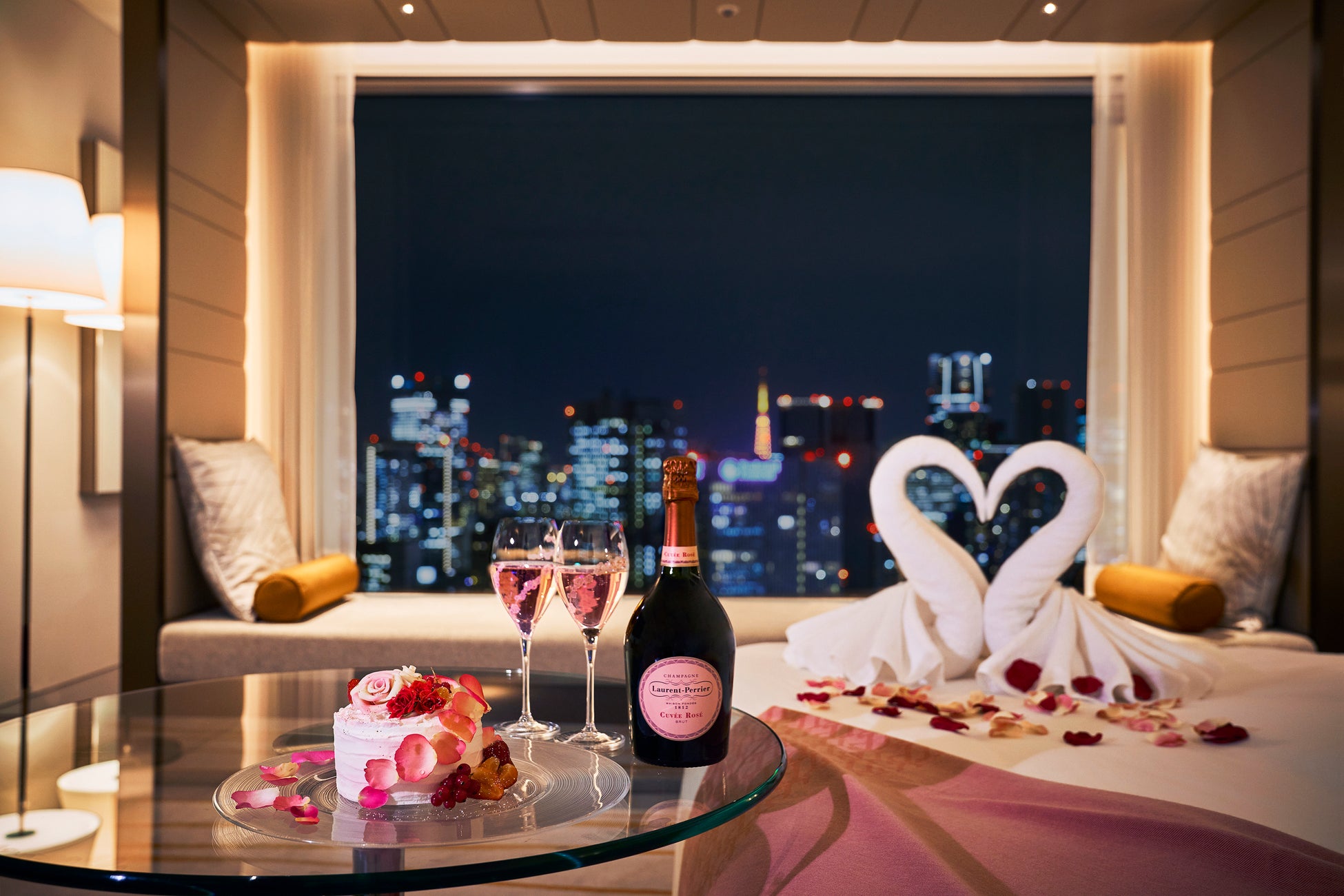 当ホテルでは、東京タワーや東京スカイツリーなどをはじめ都心の煌めく夜景を高層階のプライベートな客室からゆったりとお楽しみいただけます。この美しい夜景とともに大切な方とのクリスマスを演出するアイテムとして、フランスの名門シャンパーニュ ローラン・ペリエのロゼシャンパン、バラのケーキなどをご用意しました。