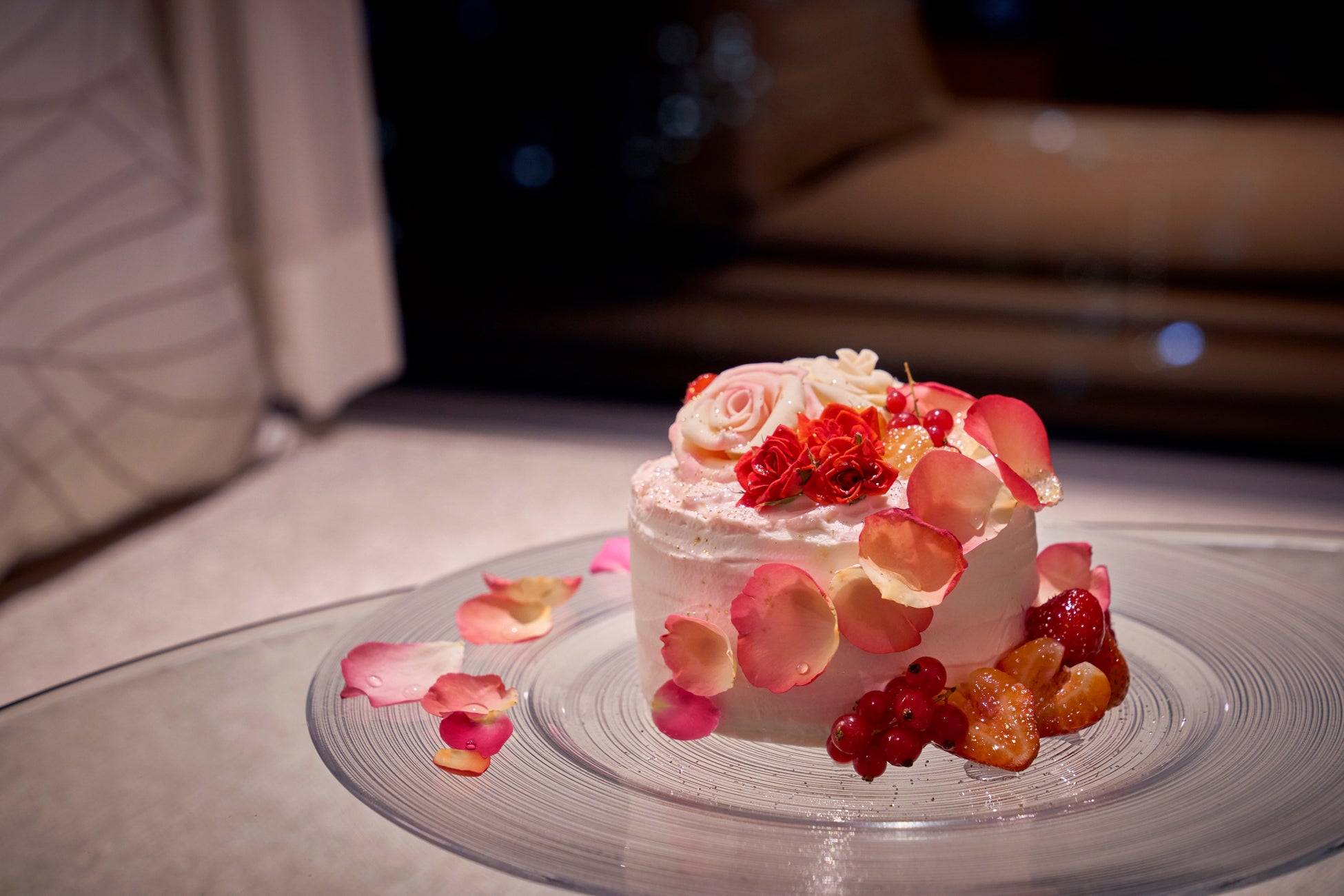 客室では、ローズペダルのアートやタオルアートを飾り華やかにお客さまをお迎え。ご希望の時間にお届けするクリスマスケーキは、ストロベリーのショートケーキに、パティシエが一枚ずつ丁寧に作りこんだバラや甘ずっぱいベリーをのせた、本プラン限定の特製ケーキです。ラズベリーやストロベリーの香りに包まれる芳醇な味わいと、きめ細やかな泡立ちが魅力のローラン・ペリエ ロゼと共にお楽しみいただけます。