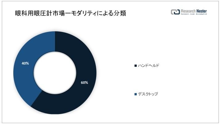 モダリティに基づいて、世界の眼科眼圧計市場は、デスクトップとハンドヘルドの需要と供給について分割および分析されます。これら2つのタイプのセグメントの中で、ハンドヘルドセグメントは、世界の眼科眼圧計市場で最大の市場規模を獲得すると予想されます。セグメントの成長は、これらのデバイスによって提供される患者の快適性の向上に起因する可能性があり、メーカーによる革新的な製品の発売は、予測期間中にセグメントの成長を促進すると予想される要因です。たとえば、2021年3月、ICARE FINLAND OYは次世代の自己眼圧計HOME2を発売しました。