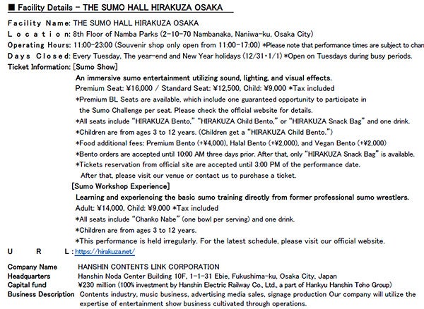 Location: THE SUMO HALL HIRAKUZA OSAKA (8th Floor, Namba Parks, 2-10-70 Nambanaka, Naniwa-ku, Osaka)