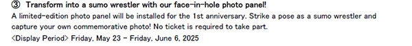 1周年記念の限定フォトパネルが登場します。相撲をテーマにしたユニークな顔出しパネルで、自分だけの記念写真を撮影してみませんか。公演チケットをお持ちでない方も撮影可能です。