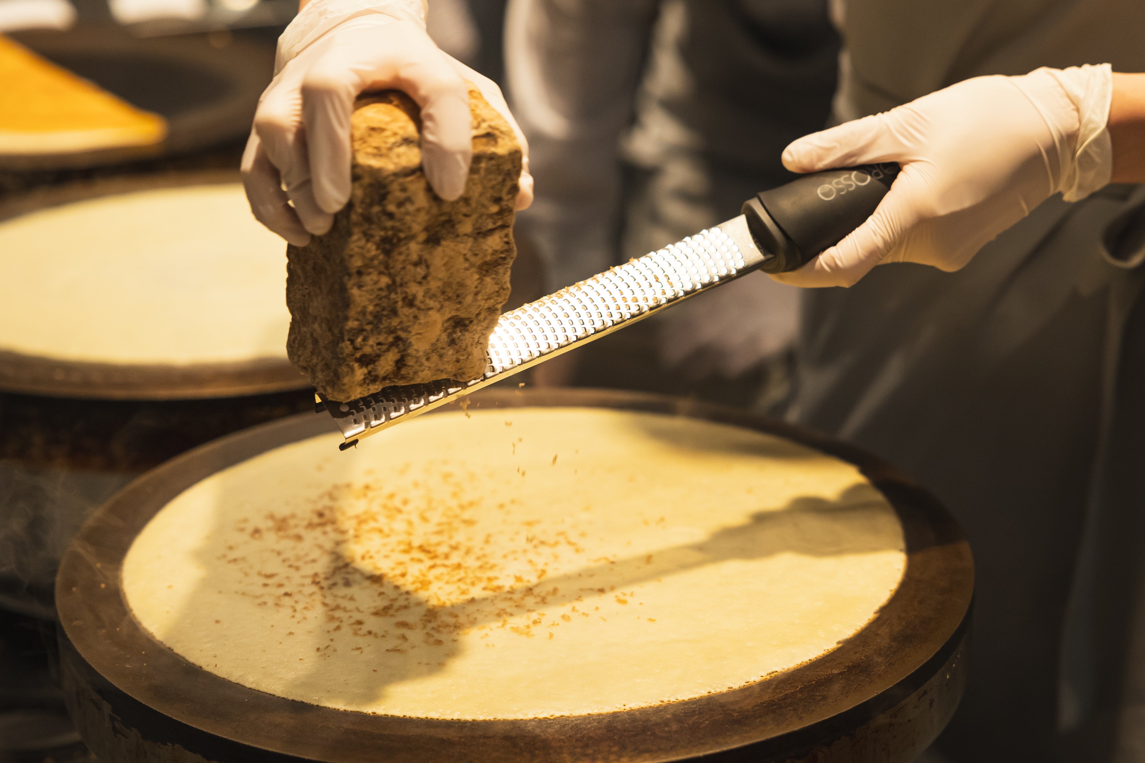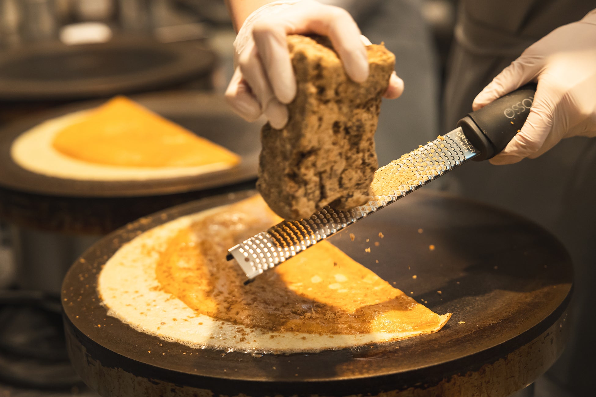 外はカリッと中はモチッとした食感を楽しめるピケカフェオリジナルの生地に、沖縄の特産品である「黒糖」を贅沢にふ削りかけます。