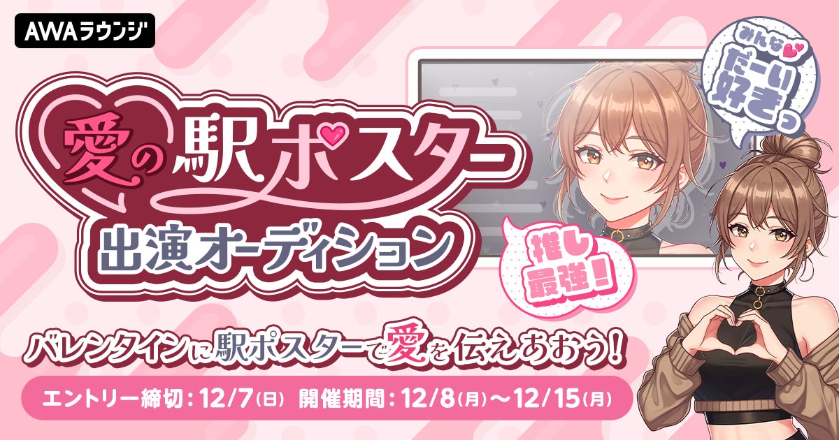 AWA株式会社(本社:東京都港区、代表取締役CEO:冨樫晃己)が運営する、サブスクリプション型(定額制)音楽ストリーミングサービス「AWA(アワ)」は、バレンタイン時期に都内主要駅ポスターに掲載されるチャンスを掴める、♡愛♡の駅ポスター出演オーディションを開催いたします。