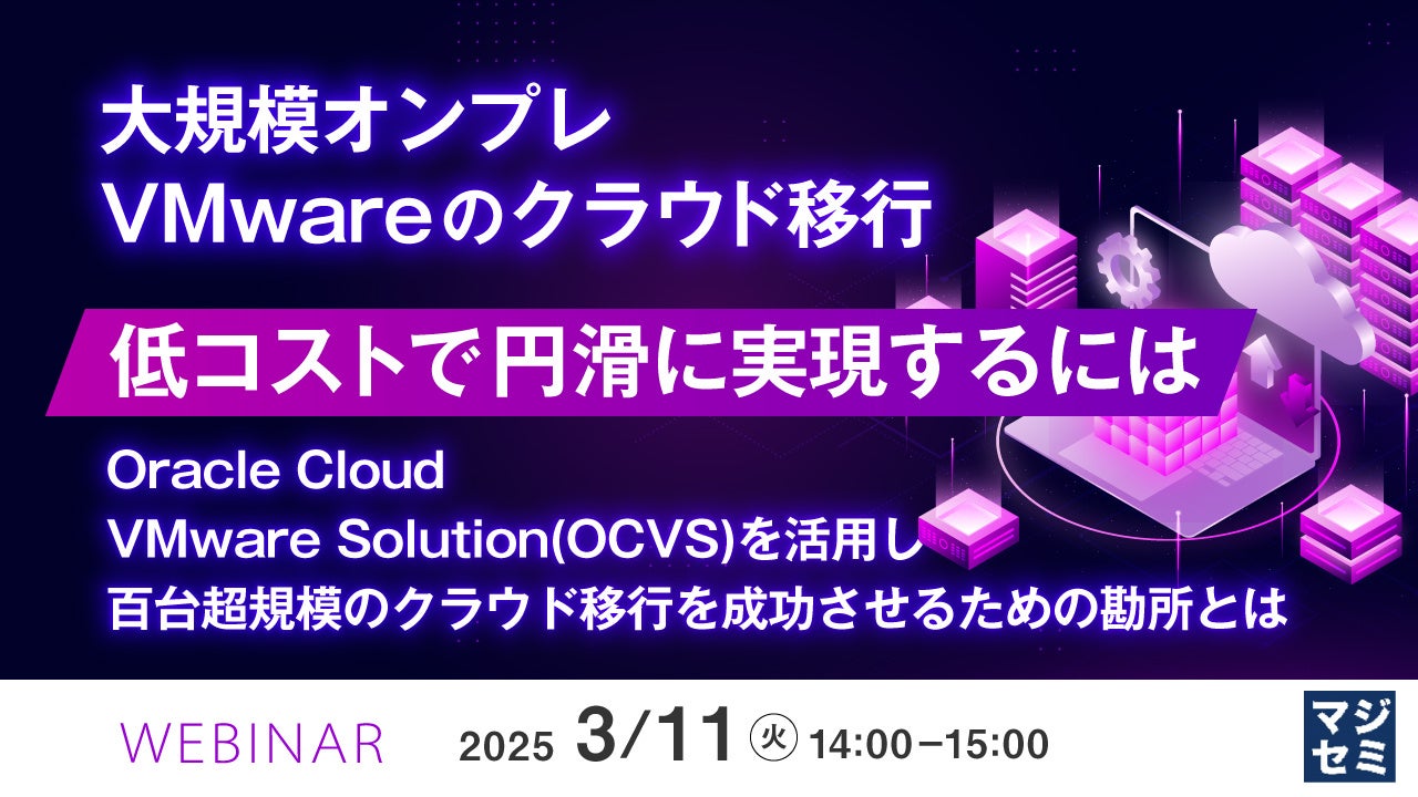 マジセミ株式会社は「大規模オンプレVMwareのクラウド移行、低コストで円滑に実現するには」というテーマのウェビナーを開催します。