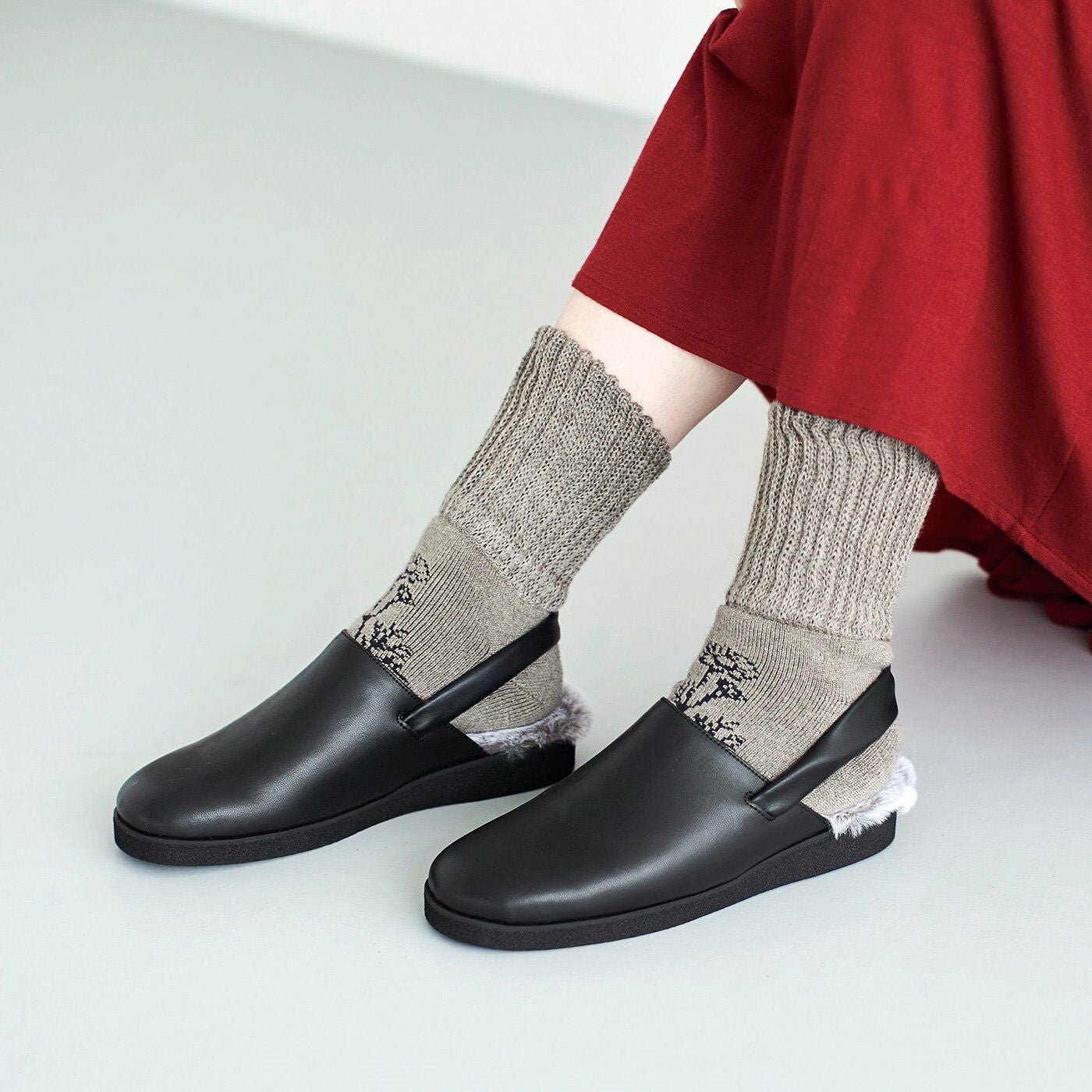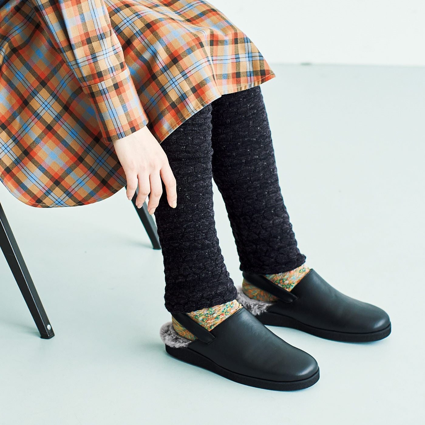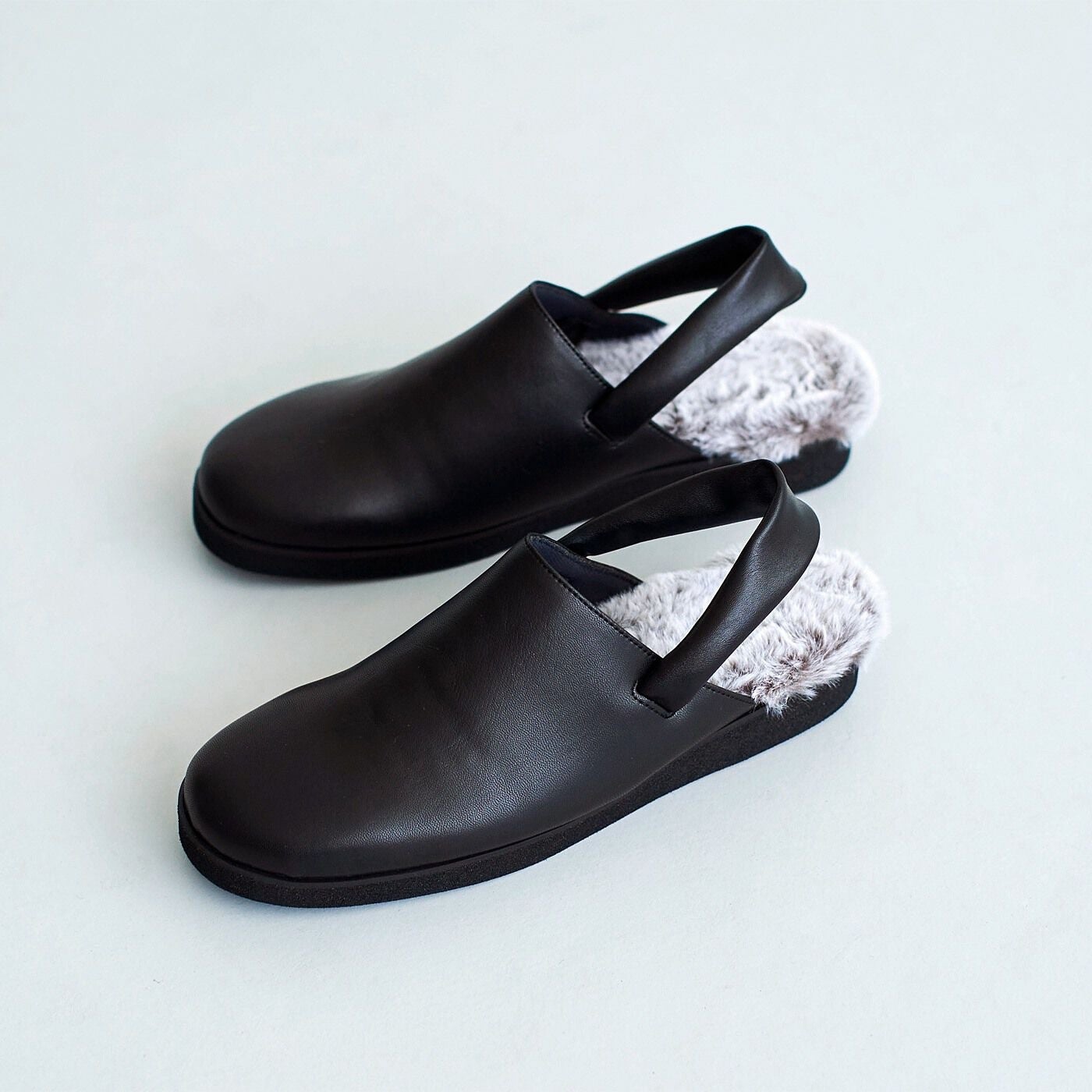 神戸・長田の職人さんが手づくりするサボサンダルです。ふわふわフェイクファーのインソールが、冬の足もとを新鮮に演出します。かかとバンドは縫い目を表に出さない、肌当たりのよい仕様です。アッパー内側はクッション入りのメッシュ素材で、甲やつま先の当たりをやわらかく仕立てました。